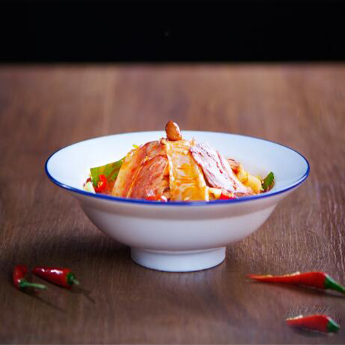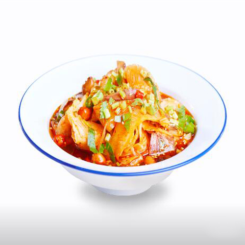 四川名菜,通常以牛頭皮、牛心、牛舌、牛肚、牛肉為主料,配以辣椒油、花椒面等輔料,調拌而成。色澤紅亮,質地軟嫩,口味麻辣濃香。觀之青紅碧綠,紅油重彩,顏色適亮;入口軟糯爽滑,脆筋柔糜、細嫩化渣。