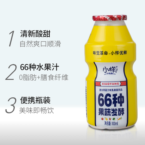 “66種果蔬發酵"乳酸菌, 由6種乳酸菌+66種蔬果發酵而成。 甄選進口發酵原料.口感清爽怡人。 突破性乳酸菌發酵工藝, 保留益生菌發酵代謝和果蔬維生素營養成分, 藍莓汁添加量21.8%。蛋白質含量21.0% , 讓乳酸菌的營養價值更高一級。 口感酸甜,營養豐富,0脂肪含量, 適合作為早督奶,好喝不怕發胖。