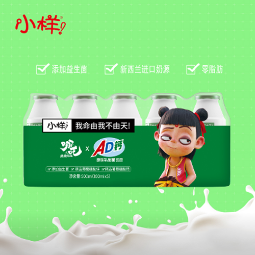 小樣&哪吒聯名款乳酸蓖飲料, 小樣&哪吒強強聯手,點燃品類熱情,打造現象級產品。 哪吒乳酸菌新品以差異化的賣點訴求和多樣化包裝形態,滿足消費者的多元化需求。 目前有100ml、200ml, 1.5L多個系列的膜包及禮盒裝產品。