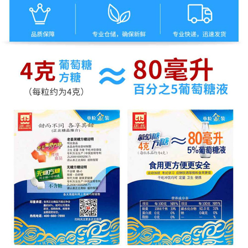 ①單粒獨立包裝 定量 衛(wèi)生 攜帶方便②使用主料為100%食用級葡萄糖 天然更健康③4g葡萄糖方糖≈80ml 5%的葡萄糖注射液④葡萄糖食用比肌注、比輸液更安全⑤專利生產(chǎn)線制造,全程潔凈化、無菌化⑥60年專業(yè)制糖歷史,中國方糖第一品牌 功能糖專家 堅實的品牌后盾