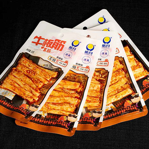 選用牛板筋原料,手工分切,切條狀,整條入味,勁道十足。