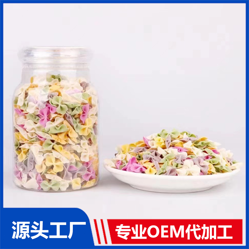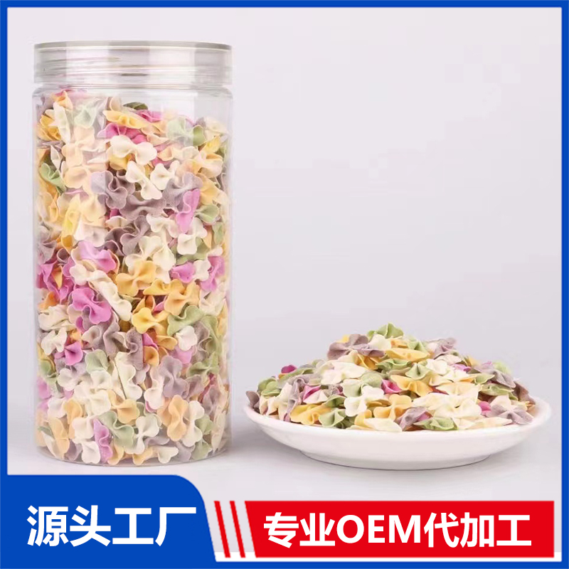 產(chǎn)品名稱:蝴蝶面瓶裝OEM/ODM 果蔬面條代加工兒童小面條花色掛面貼牌加工廠家