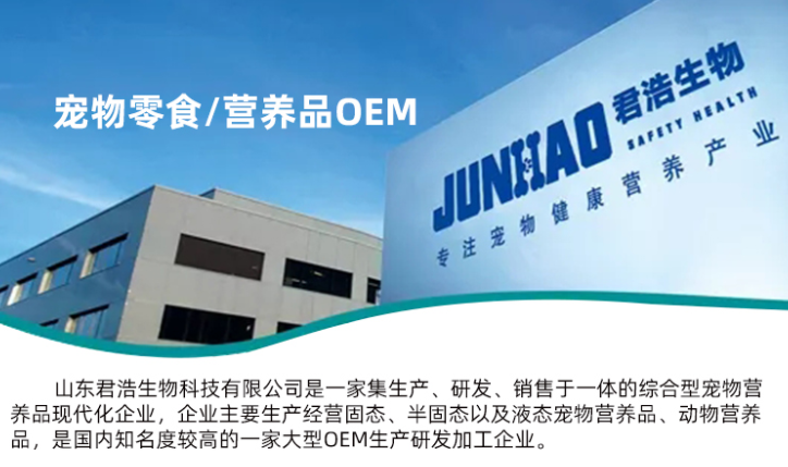 君浩生物下設山東君浩生物科技有限公司和山東君浩寵物食品有限公司主要從事寵物營養品和零食的生產加工及銷售,共占地1.8萬平方米.是專注研發、