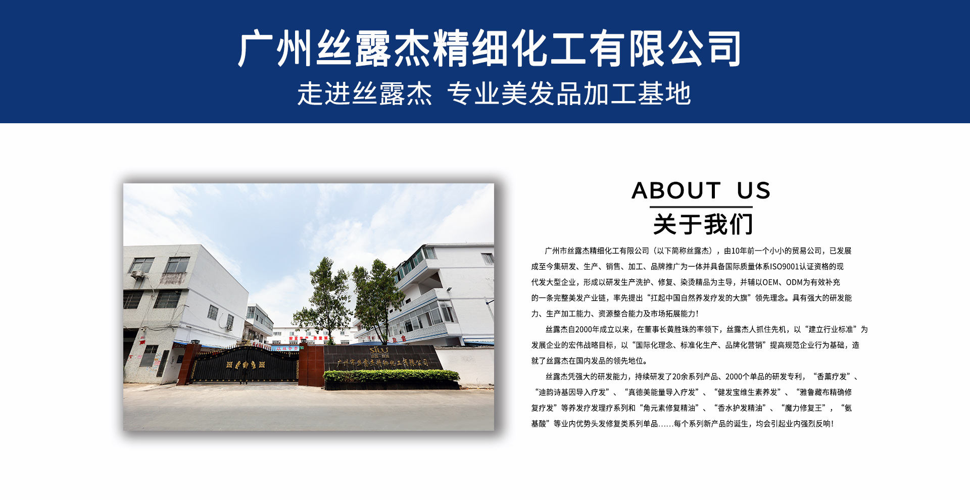 廣州市絲露杰精細化工有限公司,發展至今,已成為集研發,生產,銷售,加工,品牌推廣為一體并通過ISO9001質量管理體系認證資格的現代美發產品大型企業,形成以研發生產護發精油,洗護,造型,染燙精品為主導,并輔以OEM,ODM為有效補充一條完整美發產業鏈,并率先提出在國內打造“ 扛起中國自然養發療發的大旗”領先理念。且有強大的研發能力,生產加工能力,資源整合能力及市場拓展能力!