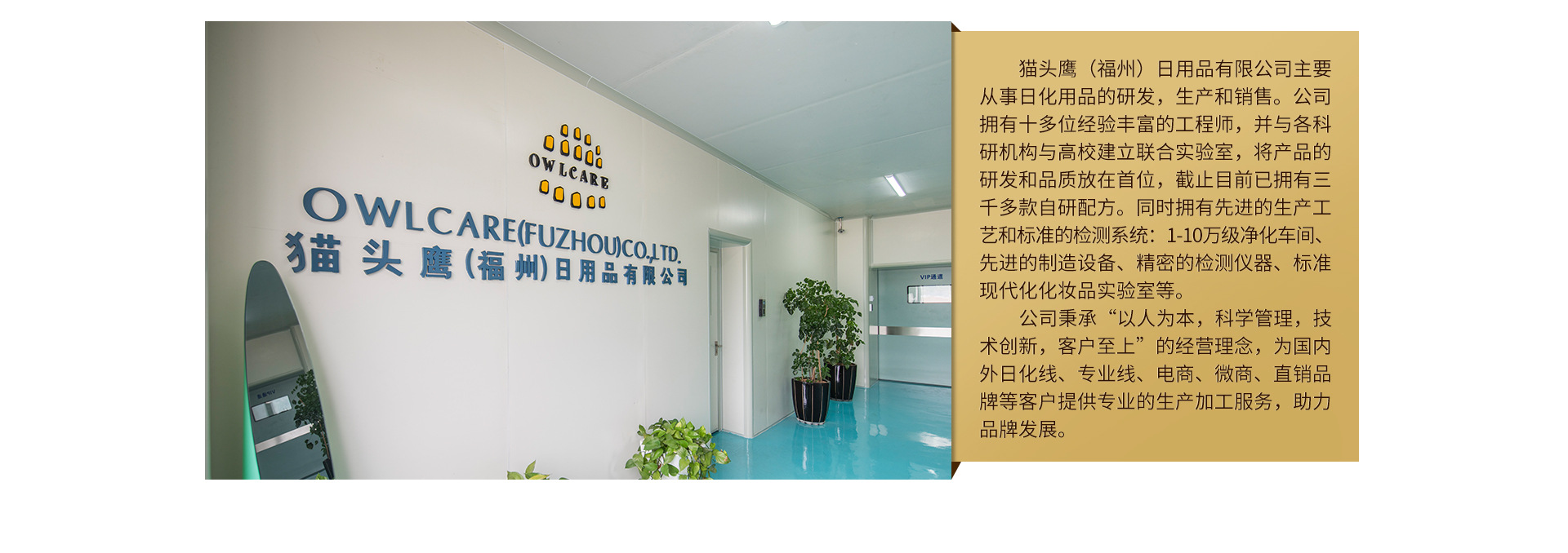 貓頭鷹(福州)日用品有限公司主要從事日化用品的研發(fā),生產(chǎn)和銷售。公司擁有十多位經(jīng)驗豐富的工程師,并與各科研機構(gòu)與高校建立聯(lián)合實驗室,將產(chǎn)品的研發(fā)和品質(zhì)放在首位,截止目前已擁有三千多款自研配方。同時擁有先進的生產(chǎn)工藝和標(biāo)準(zhǔn)的檢測系統(tǒng):1-10萬級凈化車間、先進的制造設(shè)備、精密的檢測儀器、標(biāo)準(zhǔn)現(xiàn)代化化妝品實驗室等。 公司秉承“以人為本,科學(xué)管理,技術(shù)創(chuàng)新,客戶至上”的經(jīng)營理念,為國內(nèi)外日化線、專業(yè)線、電商、微商、直銷品牌等客戶提供專業(yè)的生產(chǎn)加工服務(wù),助力品牌發(fā)展。