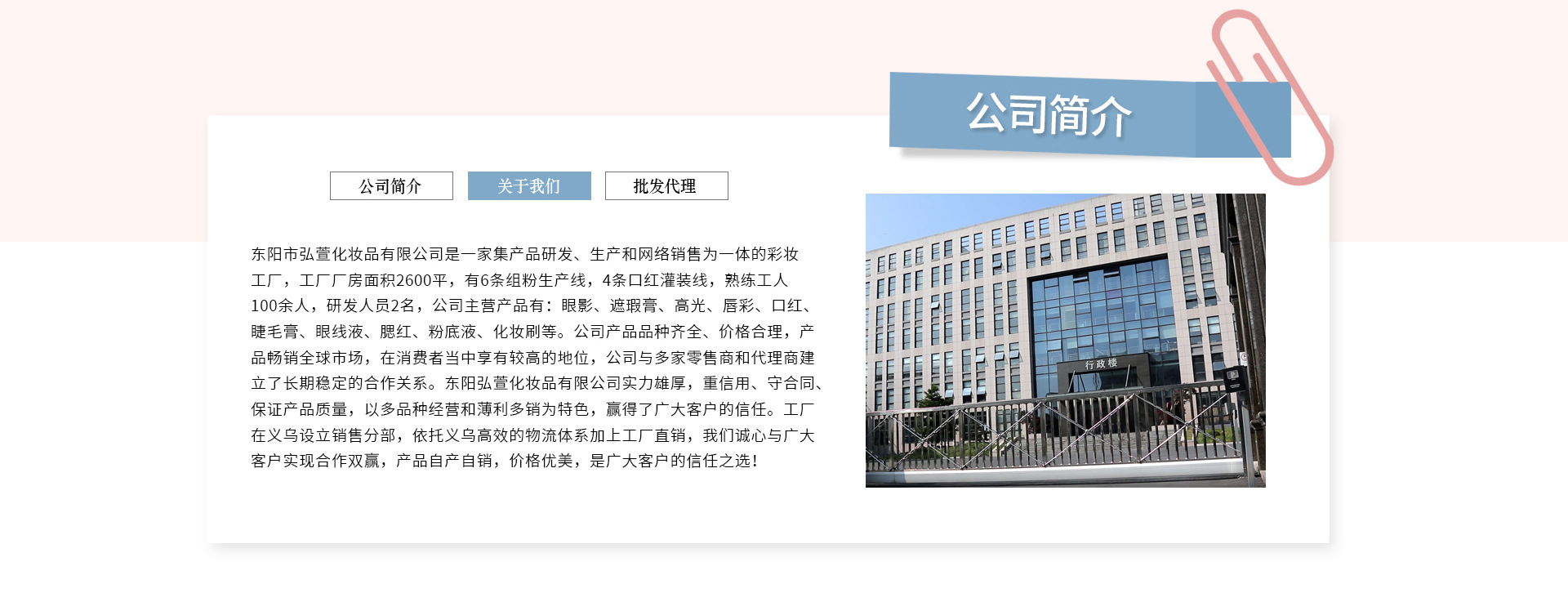 東陽市弘萱化妝品有限公司是一家集產品研發、生產和網絡銷售為一體的彩妝工廠,工廠廠房面積2600平,有6條組粉生產線,4條口紅灌裝線,熟練工人100余人,研發人員2名,公司主營產品有:眼影、遮瑕膏、高光、唇彩、口紅、睫毛膏、眼線液、腮紅、粉底液、化妝刷等。公司產品品種齊全、價格合理,產品暢銷全球市場,在消費者當中享有較高的地位,公司與多家零售商和代理商建立了長期穩定的合作關系。 東陽弘萱化妝品有限公司實力雄厚,重信用、守合同、保證產品質量,以多品種經營和薄利多銷為特色,贏得了廣大客戶的信任。工廠在義烏設立銷售分部,依托義烏高效的物流體系加上工廠直銷,我們誠心與廣大客戶實現合作雙贏,產品自產自銷,價格優美,是廣大客戶的信任之選!