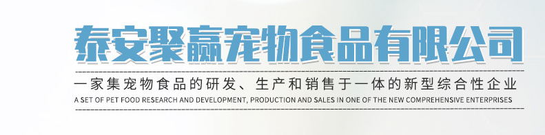 泰安聚贏寵物食品有限公司 泰安聚贏寵物食品有限公司成立于2015年,是一家集寵物食品的研發、生產和銷售于一體的新型綜合性企 業,公司擁有完整、科學的質量管理體系,有著豐富的行業經驗,專業的研發團隊,市場面向全國各地千百萬有寵一族。公司從產品的開發、生產、質量檢測、銷售、售后保證等等每一個環節都做到嚴格控制和管理,保證出廠前所有產品都經過數道過機檢測,力求生產出令每一個顧客都能滿意的產品。 公司的主要產品有妙鮮包、罐頭、貓砂、 貓糧狗糧、 寵物零食 。 產品品種齊全、價格合理,以多品種經營特色和薄利多銷的原則,贏得了廣大客戶的信任。