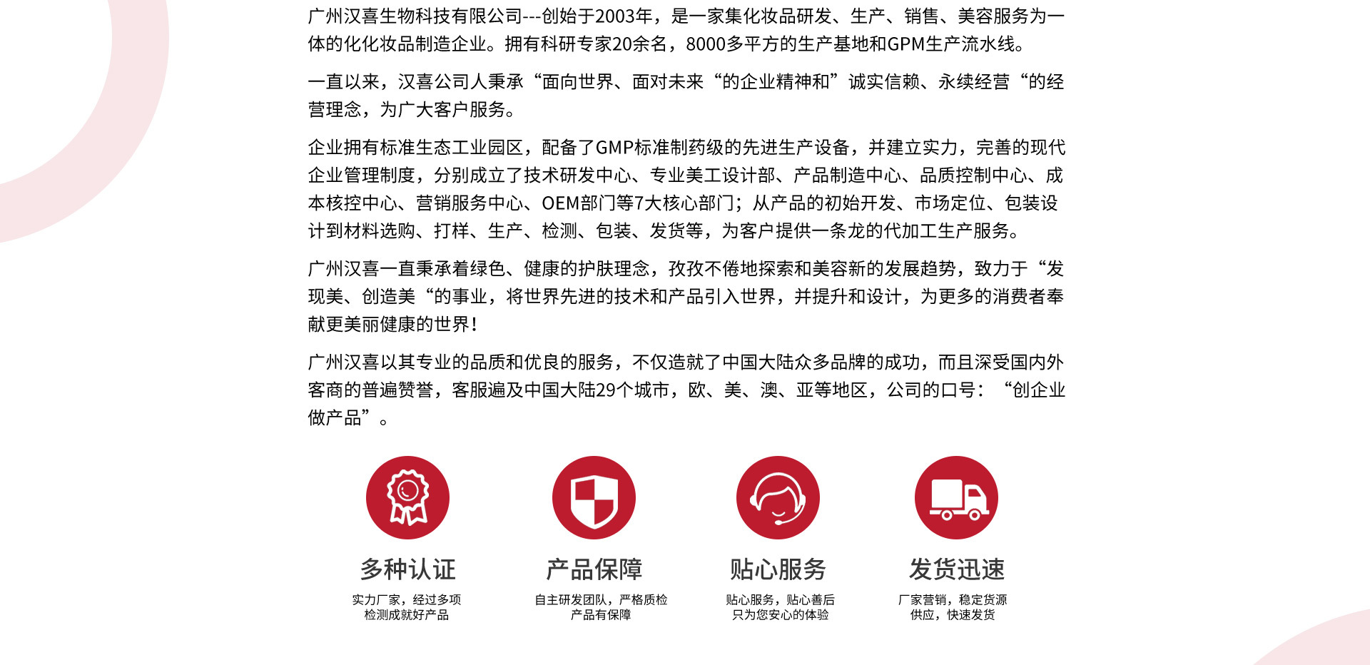 3)完善的質量管理體系和標準實驗室配置。擁有化妝品行業權威認證機構SGS認證的ISO22716、ISO14000、ISO9000與GMPC管理體系。實驗室對原材料、半成品、完成品進行重金屬、微生物全檢。把最安全健康的產品帶給消費者。