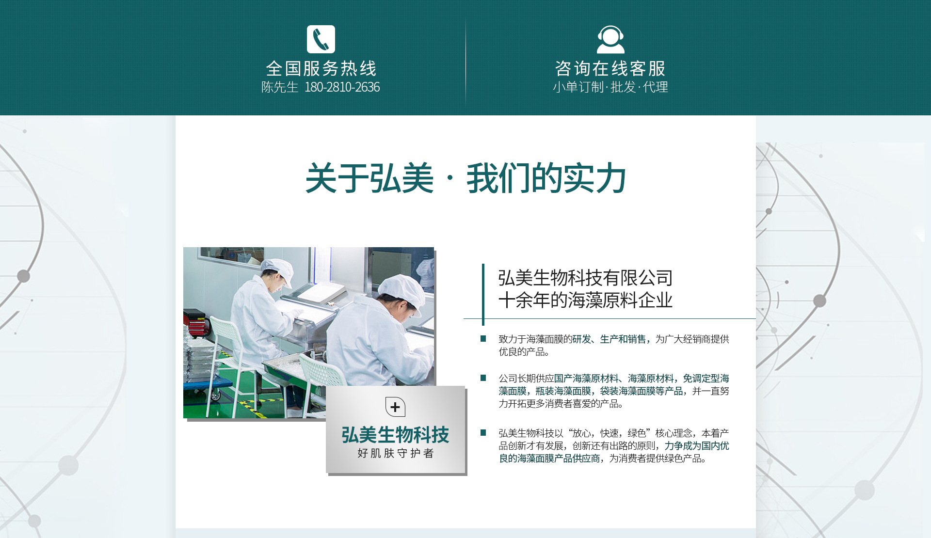 弘美生物科技有限公司致力于海藻面膜的研發(fā)、生產(chǎn)和銷售,為廣大經(jīng)銷商提供優(yōu)良的產(chǎn)品。公司長期供應(yīng)國產(chǎn)海藻原材料、進口海藻原材料,免調(diào)定型海藻面膜,瓶裝海藻面膜,袋裝海藻面膜等產(chǎn)品,并一直努力開拓更多消費者喜愛的產(chǎn)品。 弘美生物科技以“放心,快速,綠色,環(huán)保”核心理念,本著產(chǎn)品創(chuàng)新才有發(fā)展,創(chuàng)新還有出路的原則,力爭成為國內(nèi)優(yōu)良的海藻面膜產(chǎn)品供應(yīng)商,為消費者提供綠色環(huán)保的產(chǎn)品。 公司將一如既往地和廣大顧客合作共贏,共同發(fā)展致力于推動中國海藻面膜行業(yè)的健康可持續(xù)發(fā)展,為中國好品質(zhì)力盡綿薄。