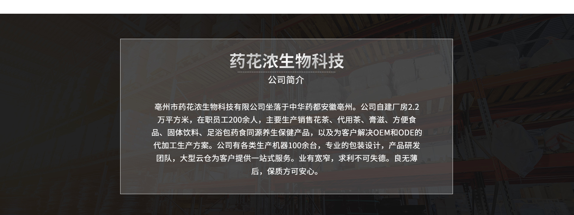 亳州市藥花濃生物科技有限公司是花茶、泡腳包、足浴包、膏滋、方便食品等產品專業生產加工的公司,擁有完整、科學的質量管理體系。亳州市藥花濃生物科技有限公司的誠信、實力和產品質量獲得業界的認可。歡迎各界朋友蒞臨參觀、指導和業務洽談。