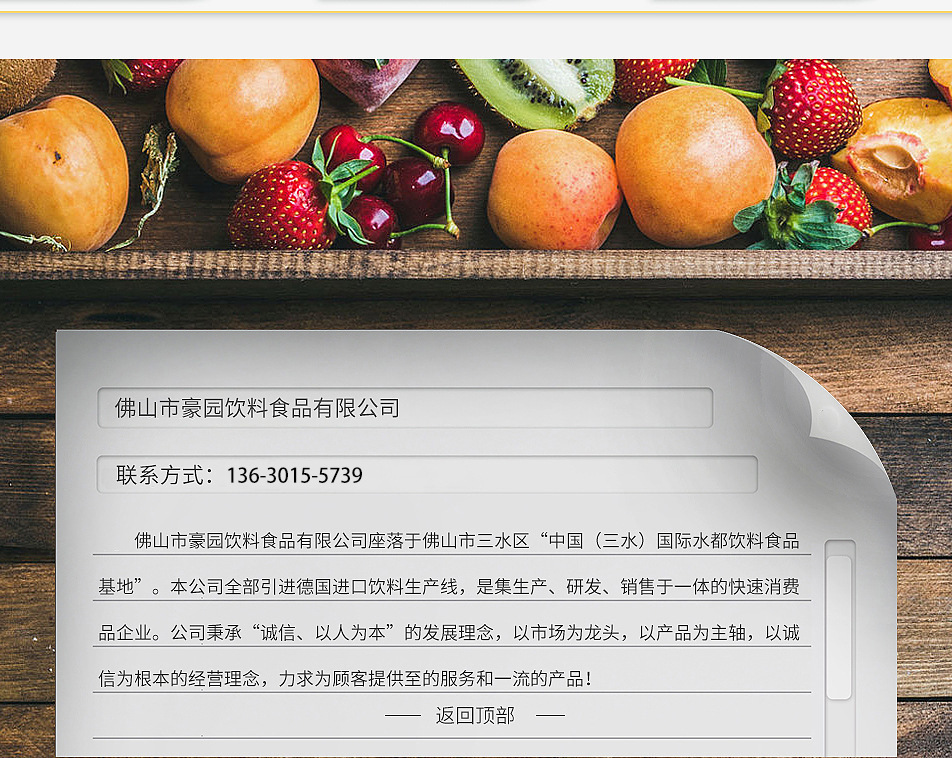 佛山市豪園飲料食品有限公司座落于佛山市三水區“中國(三水)國際水都飲料食品基地”。本公司全部引進德國進口飲料生產線,是集生產、研發、銷售于一體的快速消費品企業。公司主要生產有:椰子汁飲料、雞尾酒飲料、乳酸菌飲料、功能營養飲料、維生素飲料、運動飲料、醋飲料、果汁飲料、茶飲料、金銀花飲料、涼茶飲料、八寶粥、礦泉水等一系列產品。公司秉承“誠信、以人為本”的發展理念,以市場為龍頭,以產品為主軸,以誠信為根本的經營理念,憑借精湛的科技水平、完善的質量保證體系和一流的售后服務,力求為顧客提供至尊的服務和一流的產品! 公司全身心投入,致力于提供符合國人體質的綠色食品,以求平衡國人膳食,強壯國人體質。健康為本,快樂為魂,責任為天,不斷研發和生產豪園系列創新時尚飲品,以不斷滿足日益增長的消費需求。力求把公司打造成為公眾認可的、有社會責任感的企業。 迄今,公司已在全國各地設立了總經銷和駐地辦事處等