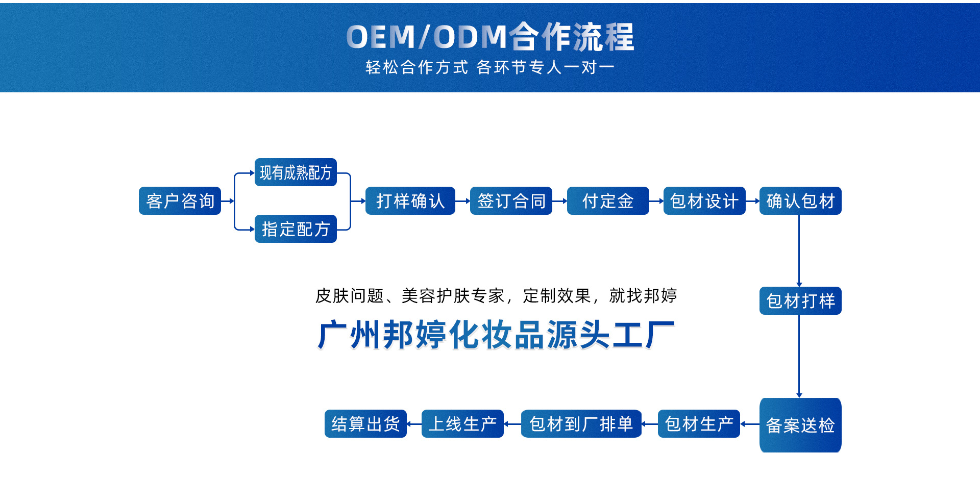 廣州邦婷化妝品有限公司創(chuàng)立于2014年,是一家專業(yè)的OEM/ODM一站式化妝品生產(chǎn)服務(wù)機(jī)構(gòu)。公司始終堅(jiān)持“品質(zhì)第一,服務(wù)至上”的原則,秉承“草本萃取,天然護(hù)膚”的健康理念,經(jīng)過六年的創(chuàng)新與發(fā)展,現(xiàn)已成長為中國著名化妝品企業(yè),目前公司產(chǎn)品已遍及全國各地,得到了眾多合作商與消費(fèi)者的廣泛認(rèn)可。 公司資質(zhì)齊全,免費(fèi)為客戶提供商標(biāo)注冊(cè)、產(chǎn)品設(shè)計(jì)、產(chǎn)品備案、一件代發(fā)等服務(wù),十萬級(jí)的無塵生產(chǎn)車間為您的產(chǎn)品品質(zhì)保駕護(hù)航。 公司可代工的品類有:面膜、眼膜、水乳套裝、清潔卸妝、鼻貼、面霜、眼霜、手霜、精華液、原液、洗手液、洗發(fā)水、沐浴露、祛斑產(chǎn)品、豐胸產(chǎn)品、減肥產(chǎn)品、脫毛產(chǎn)品等等各類清潔洗護(hù)化妝品。 產(chǎn)品功效涵蓋:補(bǔ)水保濕、舒緩修復(fù)、控油祛痘、美白祛斑、緊致嫩膚、淡化細(xì)紋、收縮毛孔、去黑頭、抗氧化、抗衰老等。