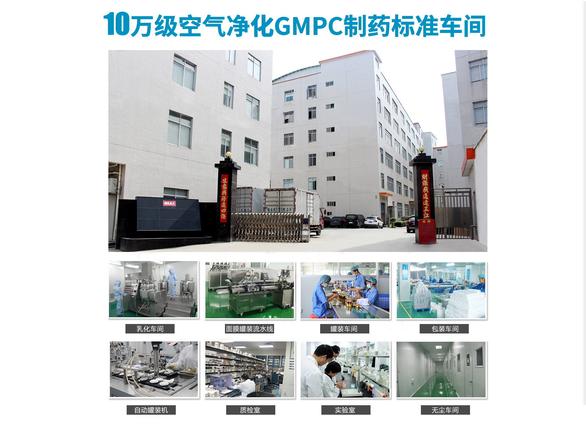 廣州藥妝生物科技有限公司是一家集研發、生產、銷售為一體的專業化妝品企業,提供批發、零售、代理和代加工貼牌OEM/ODM服務,我們所的產品有供眼霜,手霜,精油,精華液,原液,精華素,面膜,面膜貼、面貼膜,眼膜,眼膜貼,眼貼膜,面霜,臉霜,洗手液,洗發水,沐浴露,祛斑產品,豐胸產品,減肥產品,脫毛產品,衣物柔順劑,洗衣液,廚房清潔劑,潔廁劑,地板清潔劑等。 在行業內頗具口碑,坐落在交通便利、物流發達的廣州白云區龍歸。每年均通過ISO9001,GMPC(SGS),Intertek深度認證,并連續多年是廣州質量協會單位。 環境優美,廠房面積45000平方米,生產車間環境完全按照GMPC認證所需要的條件建設,并一次性通過“IS09001-2008” 質量認證和“GMPC”認證。公司目前擁有多條現代化的生產線,多臺/套國際、國內先進乳化、自動灌裝、滅菌、檢驗檢測等儀器,具備各類化妝品生產資質