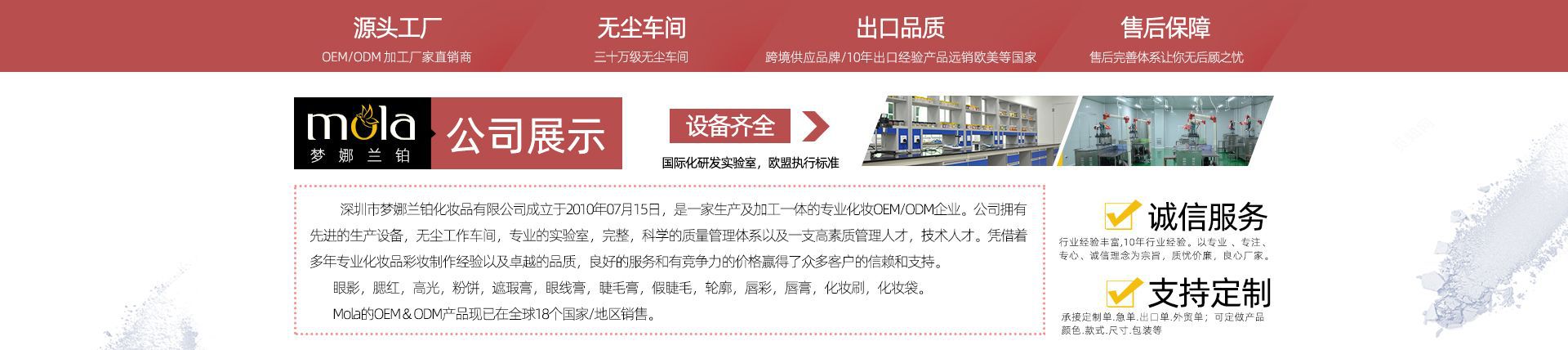 深圳市夢娜蘭鉑化妝品有限公司成立于2013年07月15日,是一家生產及加工一體的專業化妝品OEM企業。公司擁有先進的生產設備,無塵工作車間,專業的實驗室,完整,科學的質量管理體系以及一支高素質管理人才,技術人才。 公司現與百余家國內外代工客商保持長期密切合作,我們始終堅持誠信經營、精益求精、品質為先的理念,憑借尖端的研發實力,良好的技術和產品,服務于我們的客戶也深得國內外廣大客戶的青睞!同時公司的OEM和ODM產品也已在全球18個國家銷售。我們以客戶的設計想法為導向,以客戶的滿意度為標準,以客戶及市場的需求為己任,協助客戶發展自己的品牌。您的品牌,我們的研發,相信自己,選擇我們,為合作伙伴帶來長續的盈利能力,為您我創造一個雙贏的機會。 我們一直追求專業化發展道路,隨著公司業務不斷發展,我們在2017年將毛刷廠擴大到2000多平方米,歡迎各界朋友蒞臨參觀、指導和業務洽談。