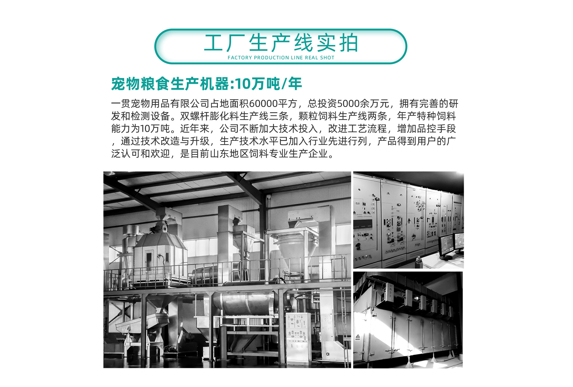 山東一貫寵物用品有限公司公司成立于2018年,但她的歷史可以追溯到上世紀(jì)八十年代,是國內(nèi)最早從事水產(chǎn)飼料研發(fā)、示范推廣的企業(yè)之一,積累了豐富的動(dòng)物營養(yǎng)研發(fā)成果和膨化糧生產(chǎn)管理經(jīng)驗(yàn),是集寵物飼料、寵物零食、寵物營養(yǎng)品加工貿(mào)易出口于一體的綜合性寵物用品專業(yè)企業(yè)。公司占地5萬多平方米,員工100余人,技術(shù)科研人員20余人,擁有年產(chǎn)2萬噸數(shù)控生產(chǎn)線5條,公司生產(chǎn)的產(chǎn)品通過ISO22000食品質(zhì)量管理體系認(rèn)證,產(chǎn)品暢銷國內(nèi)外,深受廣大用戶喜愛。 公司秉承坦誠守信、互利共贏的經(jīng)營理念,為廣大用戶朋友提供安全、優(yōu)質(zhì)、高效、穩(wěn)定的產(chǎn)品,并提供專業(yè)技術(shù)服務(wù)、OEM代工及寵物行情資訊,不斷為用戶朋友創(chuàng)造更多、更新的價(jià)值。 一貫宗旨:更好地服務(wù)于寵物行業(yè)內(nèi)的中小企業(yè)及創(chuàng)業(yè)者,與您攜手開創(chuàng)寵物行業(yè)新天地,共同走入寵物行業(yè)新時(shí)代!真誠服務(wù),一以貫之!