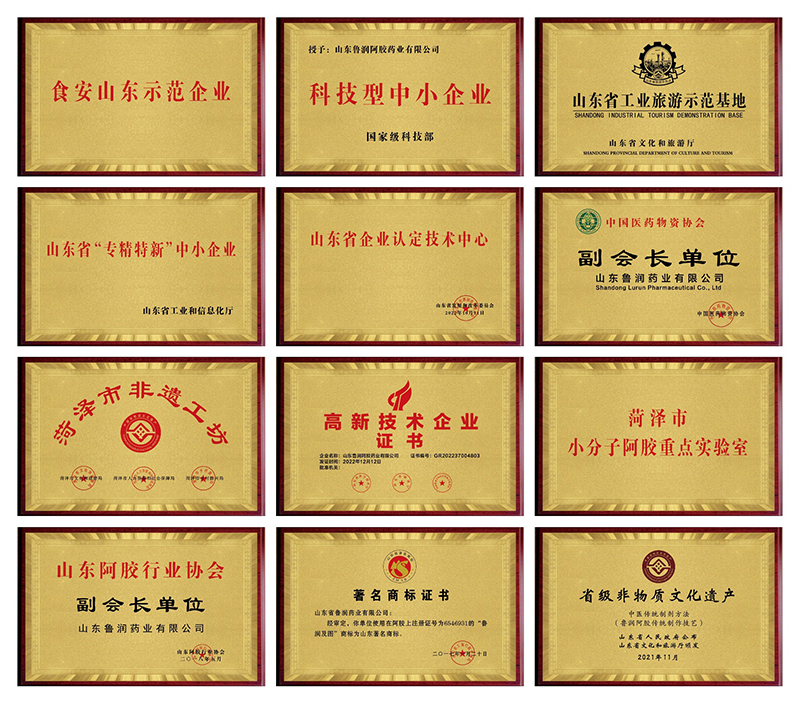 山東魯潤阿膠藥業有限公司現為“中國醫藥物資協會副會長單位”、“山東省阿膠行業協會副會長單位”、“山東省營養保健食品行業協會副會長單位”。公司先后被評為“國家級高新技術企業”、“國家級科技型中小企業”“山東省專精特新中小企業”、“山東省認定企業技術中心”、“菏澤市小分子阿膠重點實驗室”、“食安山東示范企業”、生產廠區被評為“山東省工業旅游示范基地”、“菏澤市非遺工坊”、“菏澤市非遺實踐教育基地”,并被國家安全生產監督管理總局認定為“安全生產標準化企業”。魯潤阿膠制作工藝被評為“山東省非物質文化遺產”,魯潤阿膠董事長鄧來義先生被評為“阿膠制作技藝傳承人”。公司擁有七十多項專利,成功注冊“魯潤”、“多美膠”等多個商標,其中“魯潤”商標為山東省著名商標。