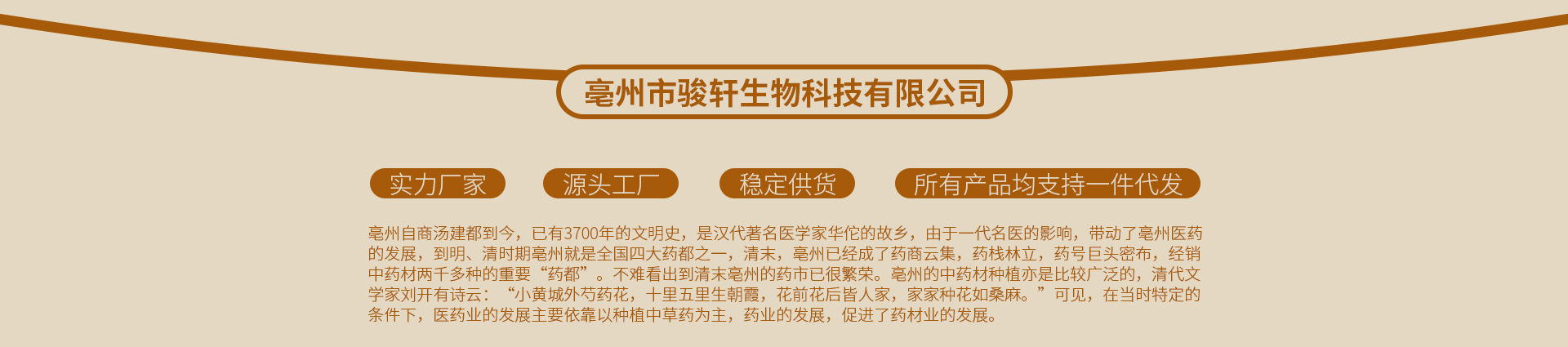 亳州市駿軒生物科技有限公司【生產銷售代用茶、固體飲料、方便食品、消毒產品、足浴包】藥食同源、農副產品購銷初加工、中藥材原藥材種植及銷售,擁有完整、科學的質量管理體系。亳州市駿軒生物科技有限公司的誠信、實力和產品質量獲得業界的認可。歡迎各界朋友蒞臨參觀、指導和業務洽談。