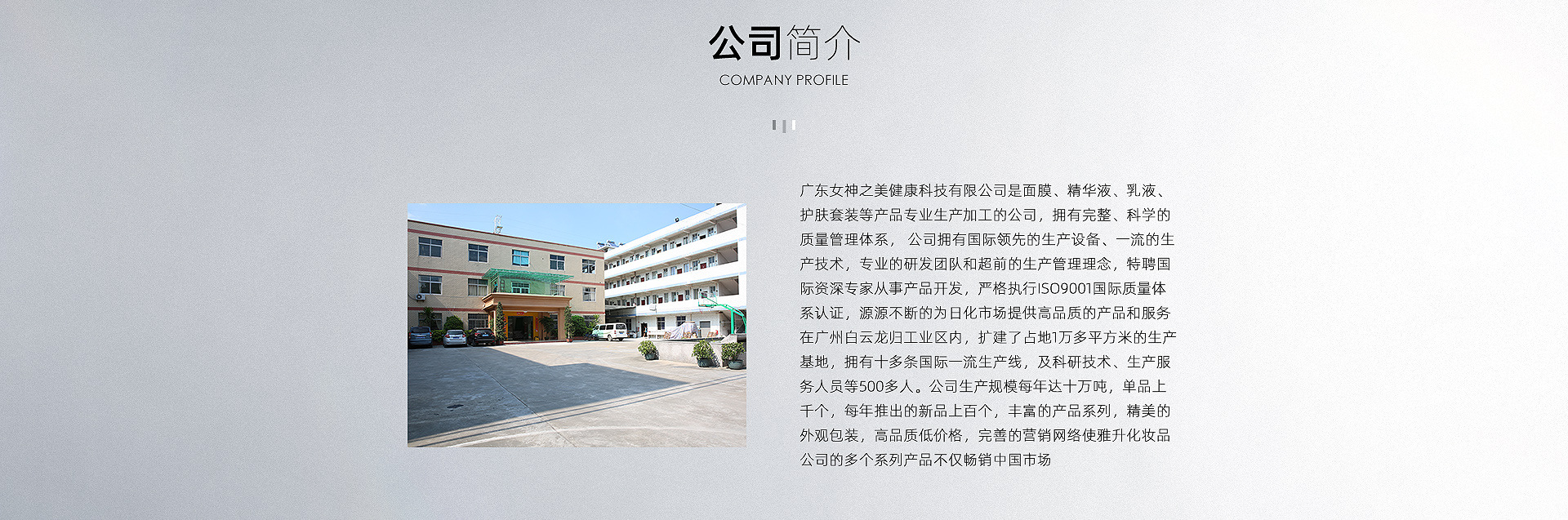 公司擁有國際領先的生產設備、一流的生產技術,專業的研發團隊和超前的生產管理理念,特聘國際資深專家從事產品開發,嚴格執行ISO9001國際質量體系認證,源源不斷的為日化市場提供高品質的產品和服務。每款新產品形成前,都經過了長期的臨床試驗和各種膚質測試,并經國家質檢部門檢測通過。在廣州白云龍歸工業區內,擴建了占地1萬多平方米的生產基地,擁有十多條國際一流生產線,及科研技術、生產服務人員等500多人。公司生產規模每年達十萬噸,單品上千個,每年推出的新品上百個,豐富的產品系列,精美的外觀包裝,高品質低價格,完善的營銷網絡使雅升化妝品公司的多個系列產品不僅暢銷中國市場,贏得了消費者的廣泛認可并倍受顧客推崇。