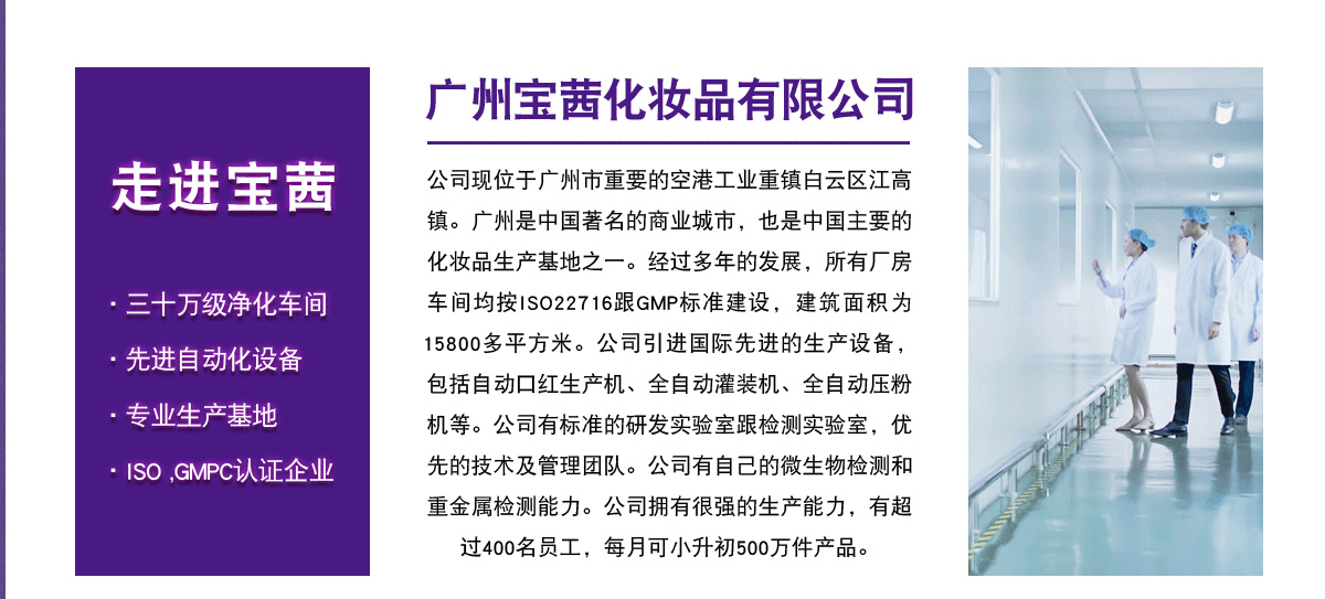 廣州寶茜工廠擁有10年的專業彩妝經驗,專業的研發團隊及開發團隊,30萬級無塵車間。工廠員工達到500人,先進的自動化設備,精湛的技術跟專業的團隊。