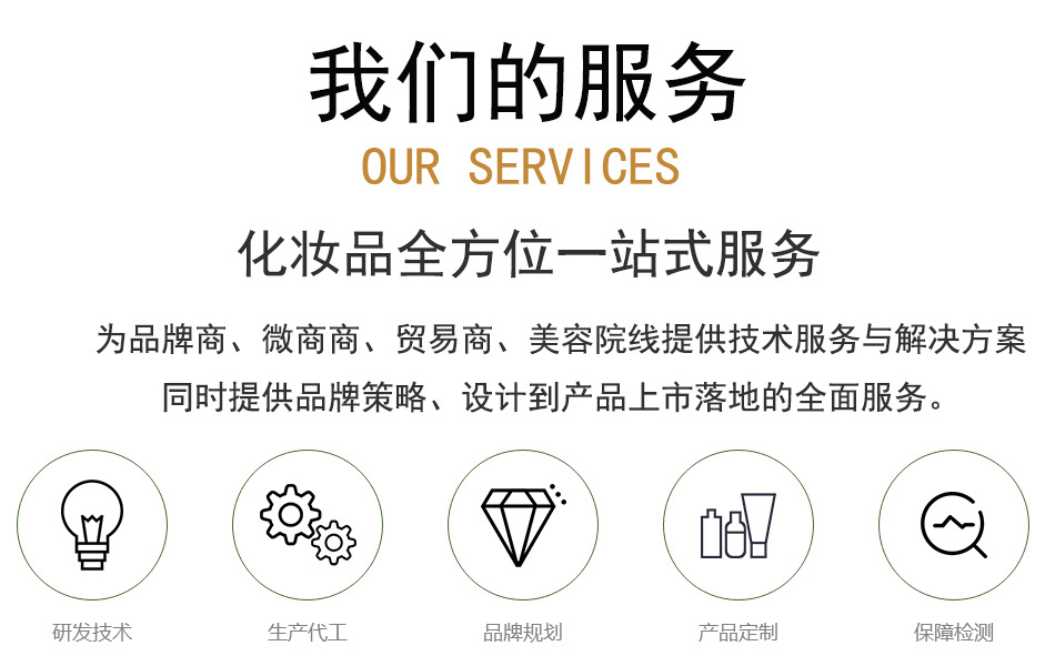 廣州諾大藥妝生物科技有限公司是一家集研發、生產為一體的專業化妝品企業,提供化妝品貼牌批發、零售、代理等服務。公司擁有15年的研發經驗,駐廠高級工程師6人,中級工程師8人,同時與國內多家知名品牌科研中心合作,擁有龐大的研發部,技術一流。公司通過了美國FDA認