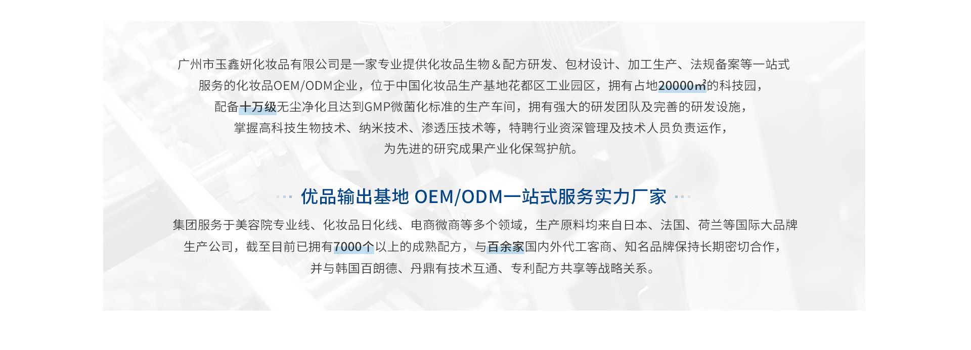 廣州市玉鑫妍化妝品有限公司是一家集化妝品生物研發(fā)、配方設(shè)計(jì)、加工生產(chǎn)及配套性服務(wù)于一體的全球性化妝品OEM/ODM服務(wù)企業(yè)。目前擁有兩萬平方米的科技園,十萬級無塵生產(chǎn)車間,15條全自動化生產(chǎn)線,引進(jìn)了國際先進(jìn)生產(chǎn)設(shè)備,如自動化次拋原液,凍干粉設(shè)備,全自動面膜膏霜灌裝設(shè)備等,遵循嚴(yán)苛的國際歐盟管理標(biāo)準(zhǔn),服務(wù)于美容院專業(yè)線、化妝品日化線、電商微商、網(wǎng)紅爆品等幾大領(lǐng)域,是領(lǐng)先的技術(shù)創(chuàng)新驅(qū)動型企業(yè),在化妝品行業(yè)擁有重要影響力。 我們以“成就客戶”為中心,以市場為導(dǎo)向,以打造“一站式護(hù)膚品OEM代加工”為己任,以持續(xù)的技術(shù)創(chuàng)新為核心,致力于為客戶提供最佳的產(chǎn)品與服務(wù)整體解決方案。