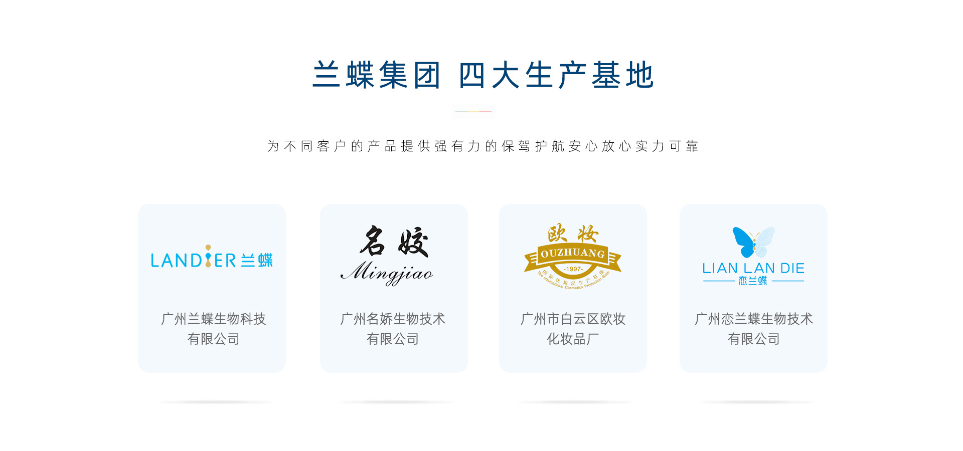 蘭蝶集團建立于1997年,總部及研發中心毗鄰風景秀麗的廣州白云區國際機場旁,是一家專注國際全新生物基因活性及草本肽能技術配方研究與生產的高科技企業集團,集團設有廣州蘭蝶生物科技有限公司、廣州市白云區歐妝化妝品廠、廣州名嬌生物科技有限公司、廣州戀蘭蝶生物技術有限公司、廣州戀蘭蝶品牌管理有限公司、廣州戀蘭蝶文化傳媒有限公司,公司技術和研發實力雄厚,一直屹立于中國美業前沿,先后獲得”中國美業推動力獎“、“全國質量誠信5A企業”及“化妝品制造優秀企業”等多項榮譽。