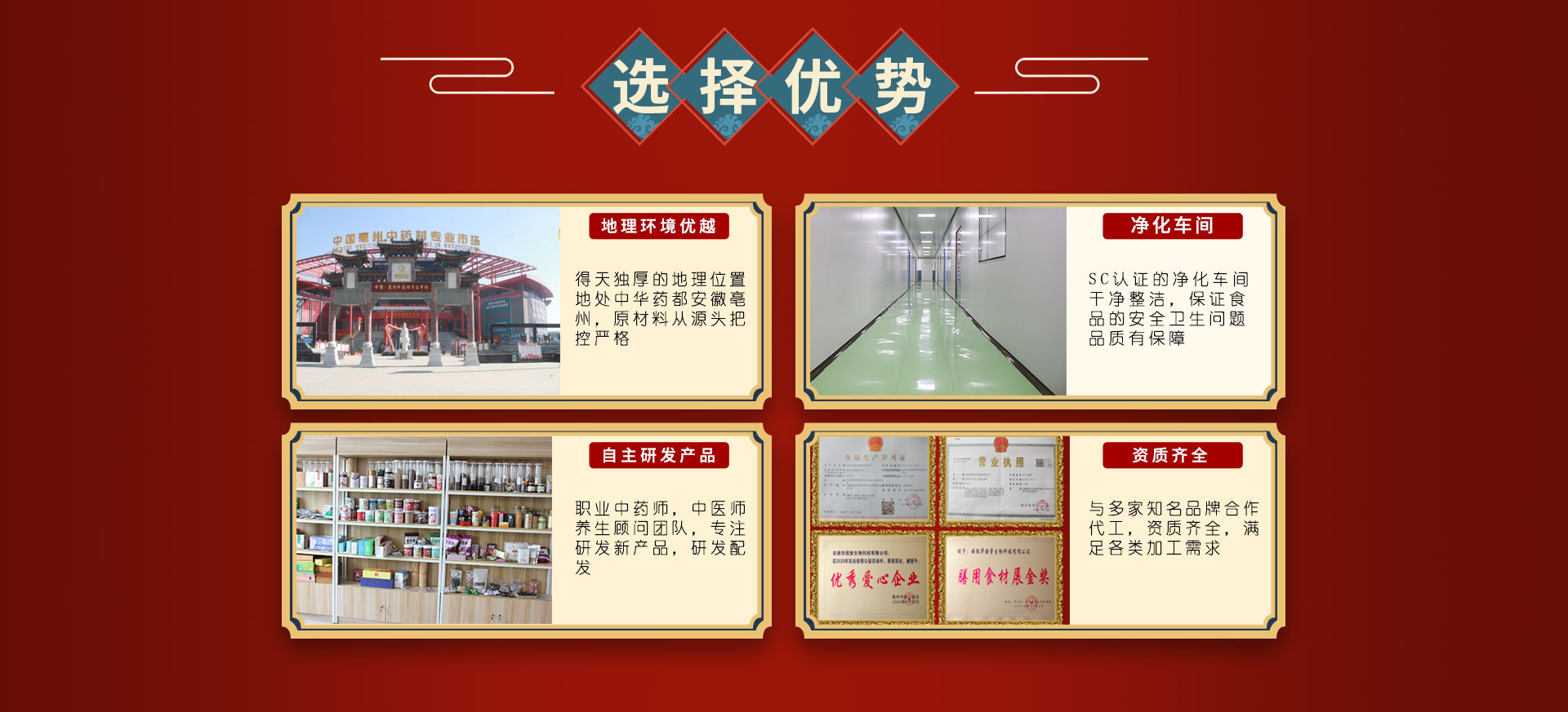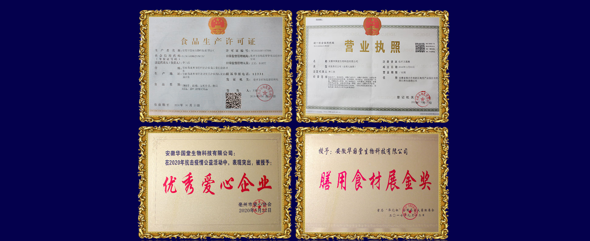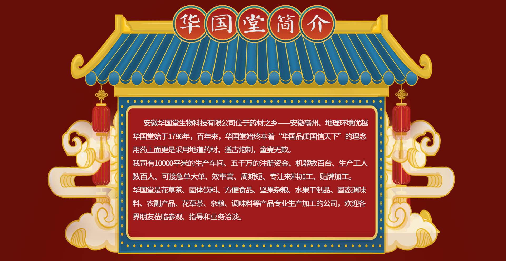 安徽華國堂生物科技有限公司創立于2015年,建筑面積3萬平方米,注冊資金5000萬,是順應電商發展潮流,一家集生產、銷售、科研為一體的現代養生產品生產企業,并在2015年通過了國家食品質量安全市場準入A級認證(即SC認證),通過了中國信用企業認證體系,質量管理體系,確保公司的產品質量符合國家標準,行業標準。擁有7大生產流水線壓片糖果,方便食品,固體飲料,代用茶 ,調味茶,堅果雜糧,消字號等,現有員工300多人,平均年齡25歲,大學以上學歷的占總人數的65%,于中醫藥膳研究院,華佗五禽戲養生文化研究所以及省高等學院簽訂了戰略合作,結合研究院與企業的各自優勢,建立產學研合作關系,形成專業、產業相互促進,最終實現產學研共贏的格局。 華國堂品牌定位:傳遞健康,踐行養生 華國堂品牌口號:華國品質,國信天下