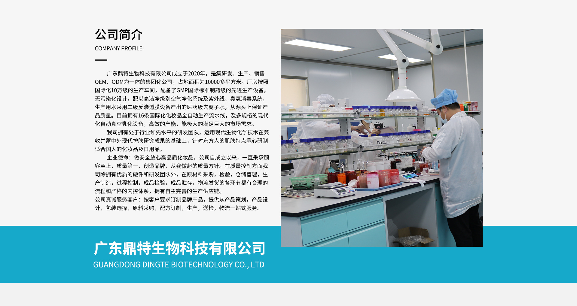 廣東鼎特生物科技有限公司成立于2020年,是集研發(fā)、生產(chǎn)、銷售、OEM、ODM為一體的集團化公司,占地面積為10000多平方米。廠房按照國際化10萬級的生產(chǎn)車間,配備了GMP國際標準制藥級的先進生產(chǎn)設備,無污染化設計,配以高潔凈級別的空氣凈化系統(tǒng)及紫外線、臭氧消毒系統(tǒng),生產(chǎn)用水采用二級反滲透膜設備產(chǎn)出的醫(yī)藥級去離子水,從源頭上保證產(chǎn)品質(zhì)量。目前擁有16條國際化的化妝品全自動生產(chǎn)流水線,及多規(guī)格的現(xiàn)代化自動真空乳化設備,高效的產(chǎn)能,能極大的滿足巨大的市場需求。 我司擁有處于行業(yè)領先水平的研發(fā)團隊,運用現(xiàn)代生物化學技術(shù),在兼收并蓄中外現(xiàn)代護膚研究成果的基礎上,針對東方人的肌膚特點,悉心研制適合國人的化妝品及日用品。 公司真誠服務客戶:按客戶要求訂制品牌產(chǎn)品,提供從產(chǎn)品策劃,產(chǎn)品設計,包裝選擇,原料采購,配方訂制,生產(chǎn),送檢,物流一站式服務