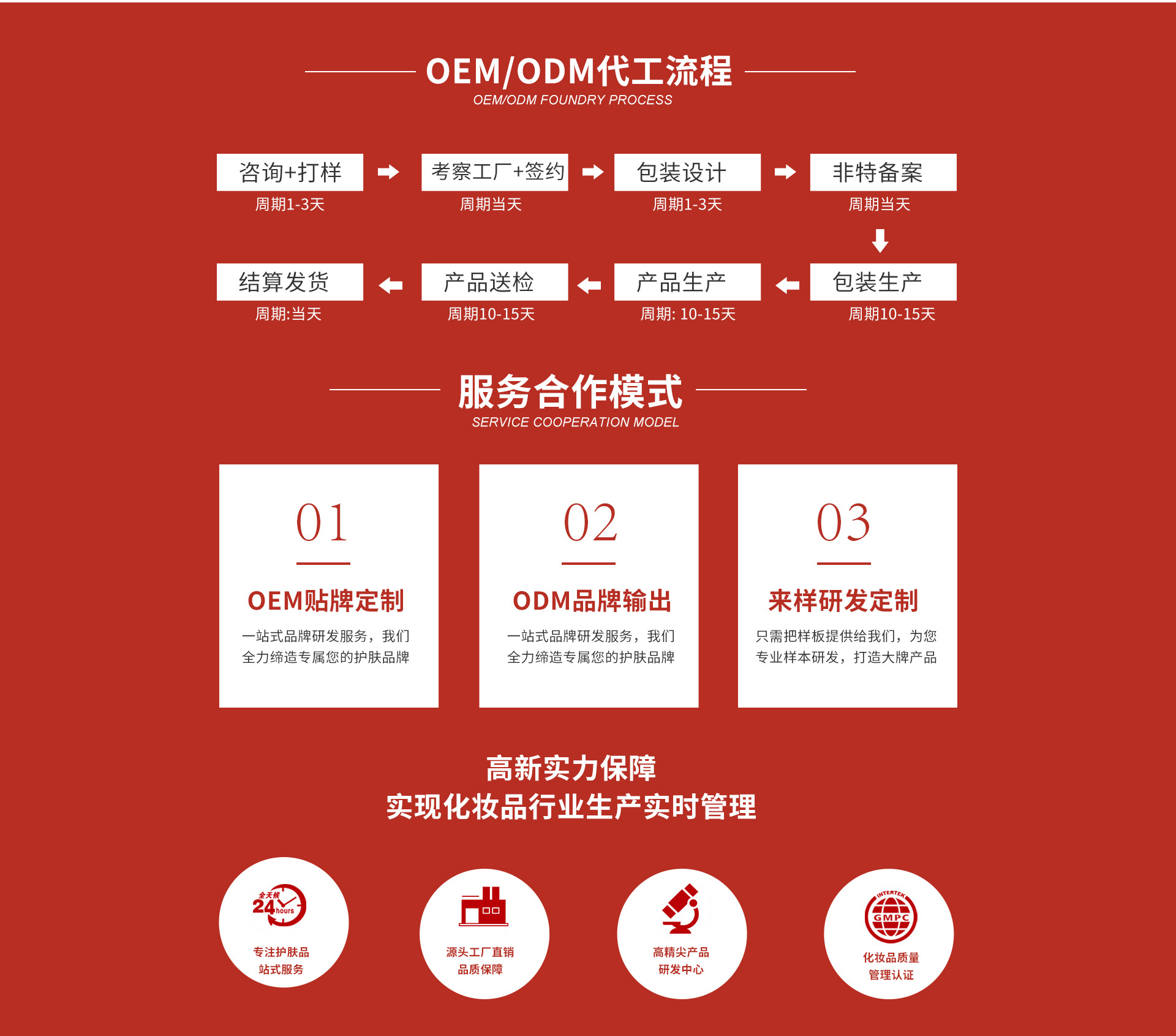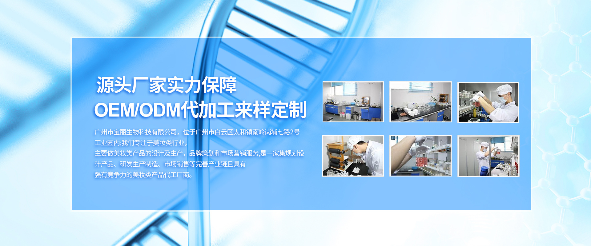 廣州市寶麗生物科技有限公司,成立于2011年,總部設于廣州市白云區太和鎮龍歸南嶺崗鋪七路二號工業園區內;專注于健康美容事業,高級護理及功效性化妝品領域的研究開發、應用以及生產、策劃和營銷服務,是一家集研發制造、連鎖經營、教育培訓于一體的美容集團。 廣州市寶麗生物科技有限公司高度重視產品的質量及研發,多年來,不斷吸納行業精英,整合強勢資源,同步掌握國際市場最新技術和流行動態,同時以前瞻性的科研技術引領健康美容新潮流,全力為美容化妝品行業提供專業的OEM/ODM一條龍業務;為眾多新生美容化妝品品牌公司提供完善的配套服務,在業內已成為化妝品行業運營管理的典范,成為眾多行業品牌成功的幕后高手! 2013年,廣州市寶麗生物科技有限公司投入巨資建成了標準式的化妝品廠房,并特聘行業資深管理及技術人員負責運作,生產基地擁有環保舒適的現代化生產車間