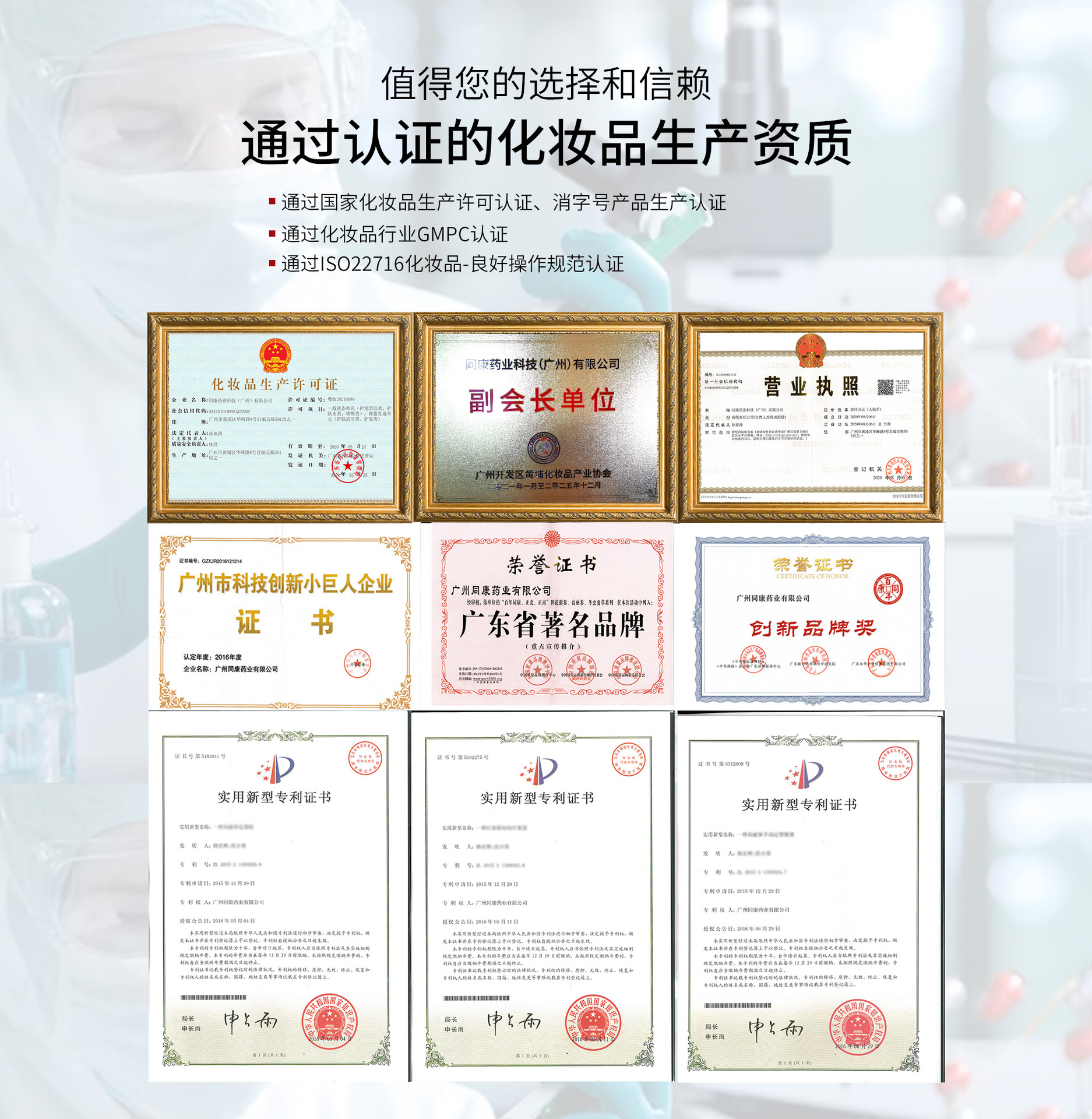 同康藥業科技(廣州)有限公司,傳承百年匠作之精神,智造民族美妝新品牌!工廠坐落于廣州市國家級經濟開發區--黃埔區,在百年同康藥業集團的大健康產業園區內。工廠占地面積2萬多平方米,有妝字號、消字號、械字號的10萬級凈化生產車間多個,符合歐盟及美國 GMPC標準,擁有8條自動化生產線,配合園區內集團旗下的食字號車間及中藥飲片車間,真正達到了大健康產業需求的全覆蓋、一站式全方位服務。百年同康始創于1925年,秉承藥食同源理念,我們傳承經典、開拓創新,打造出具有民族特色、中醫藥特色及中國元素三者相結合的高品質產品,著力打造和孵化多個民族美妝的新品牌、大品牌!產品實現全品類代加工覆蓋,有基礎護膚系列、功效護膚系列、日化洗護系列、養生及亞健康調理系列、兩性私密及產后康復系列、孕婦及嬰童用品系列、消炎消毒抑菌系列等。百年同康,美麗同康!讓我們竭誠為廣大客戶提供一流的增值服務!