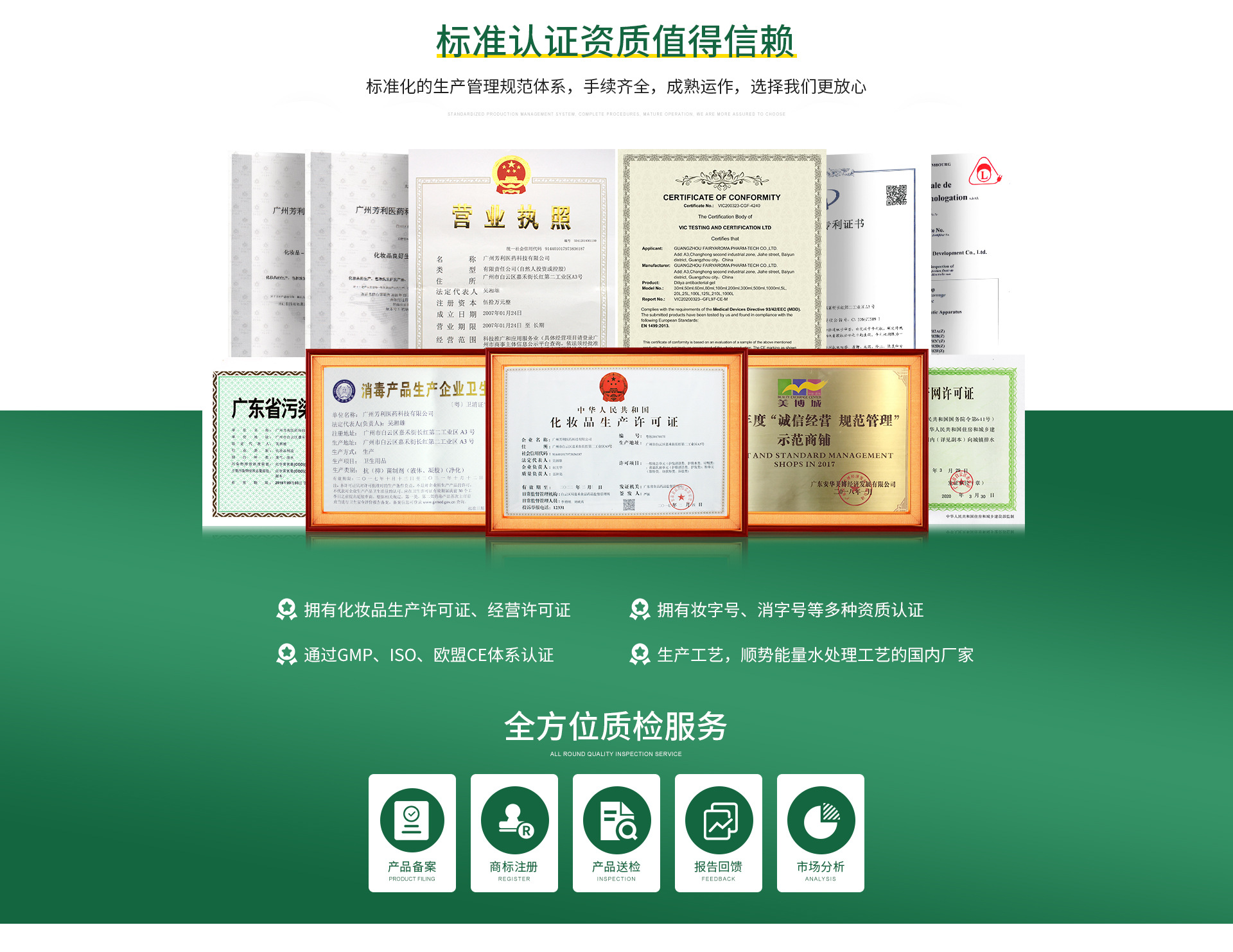 廣州芳利醫藥科技有限公司是一家擁有17年經驗的集生產,研發,銷售于一體的生產制造企業,“PURE NATURE BEAUTY”“純凈、自然、美麗”是我們的核心理念。公司以醫藥科技的嚴謹態度,優選天然高能量原料研發與制造消字號產品、化妝品以及生命健康養生品,FairyAroma芳利源、Diliya迪麗雅、Atspa愛斯帕、PENTAPHARM潘德芬等多個品牌線的產品行銷全國乃至東南亞和歐美市場。 自建廠以來我們先后投資建設了10萬級GMP車間,引進時新的生產工藝及設備,與多個科研機構展開了合作,申請了多項專利,研發了多項專有配方,踐行以天然與科技引領時尚;感恩您智慧選擇;與您共創輝煌!