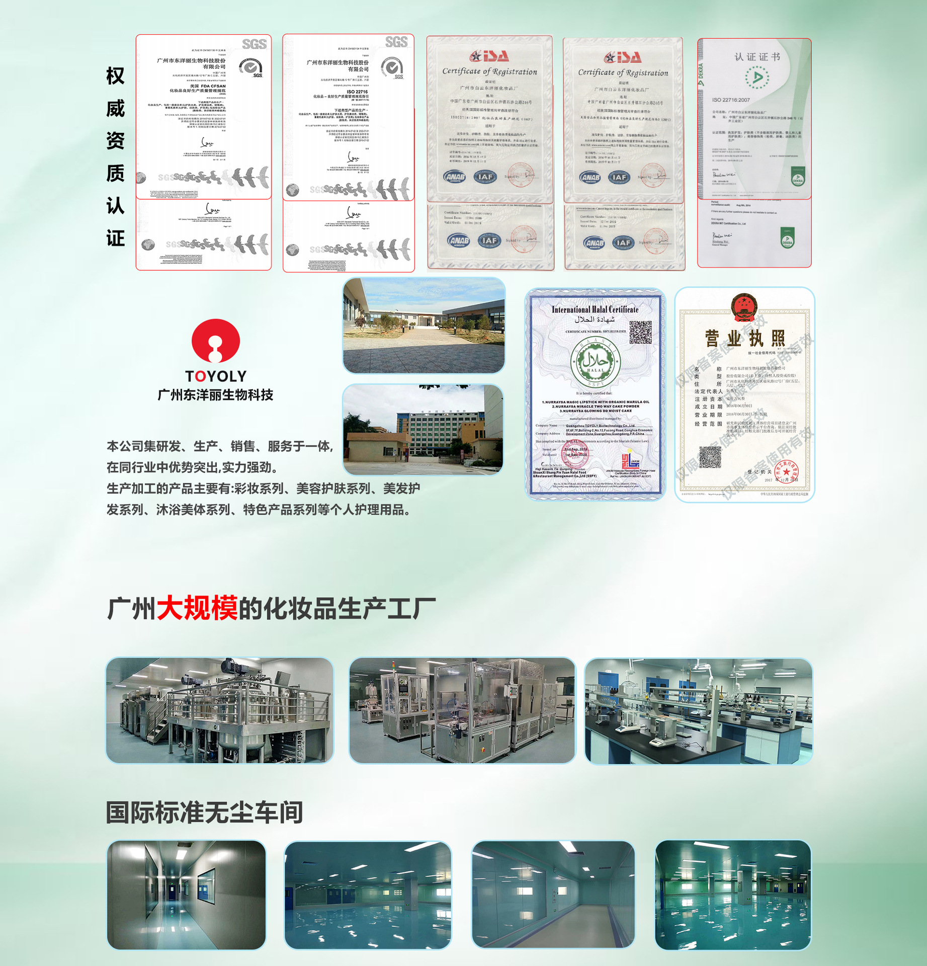 廣州東洋麗,成立于 1999 年,近 20 年的化妝品美妝加工貼牌經驗沉淀。一路走來,與我們共同攜手的品牌有: ESSUI 一秀,滋色 ZEESEA ,韓熙貞 HEXZE ,歐束 OUSHU , Larastyle ,惑辰 CORZEN , 伊詩婷 1 N SITI ,迪士尼,萊仕 UERSEA ,臺灣蝶尚小鋪,萌黛幾品牌等等。通過化妝品最高等級美國FDA頒發的GMPC認證;通過歐盟ISO22716 化妝品良好操作規范認證;通過屈臣氏供應商資質認證等。