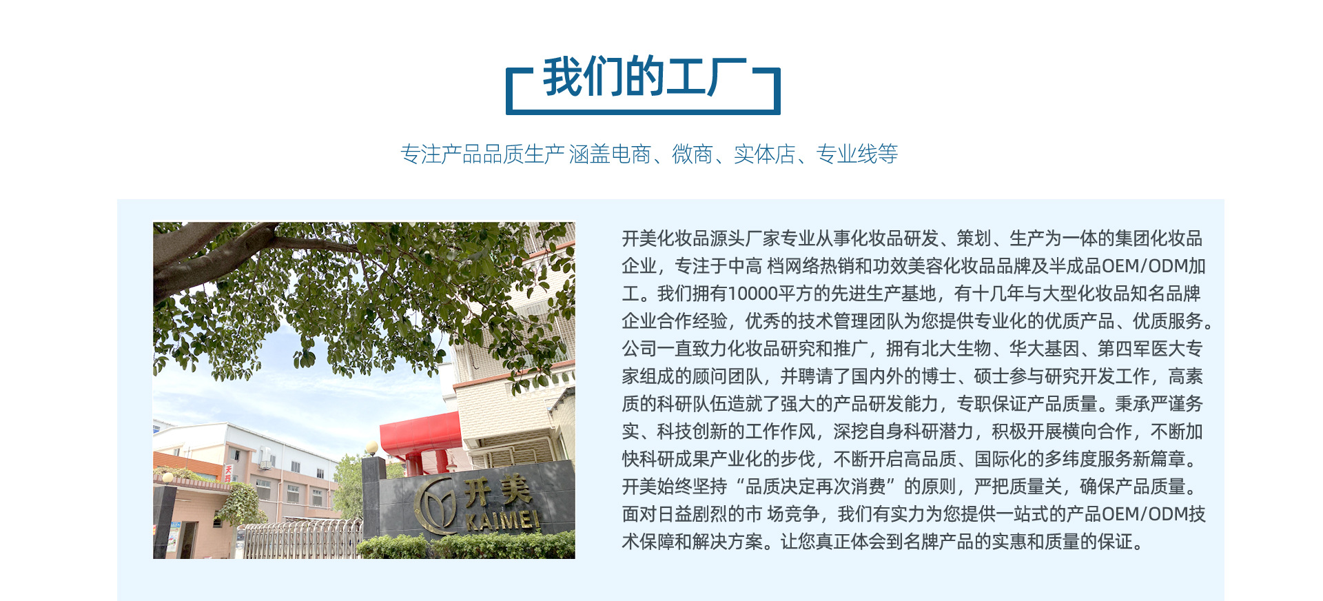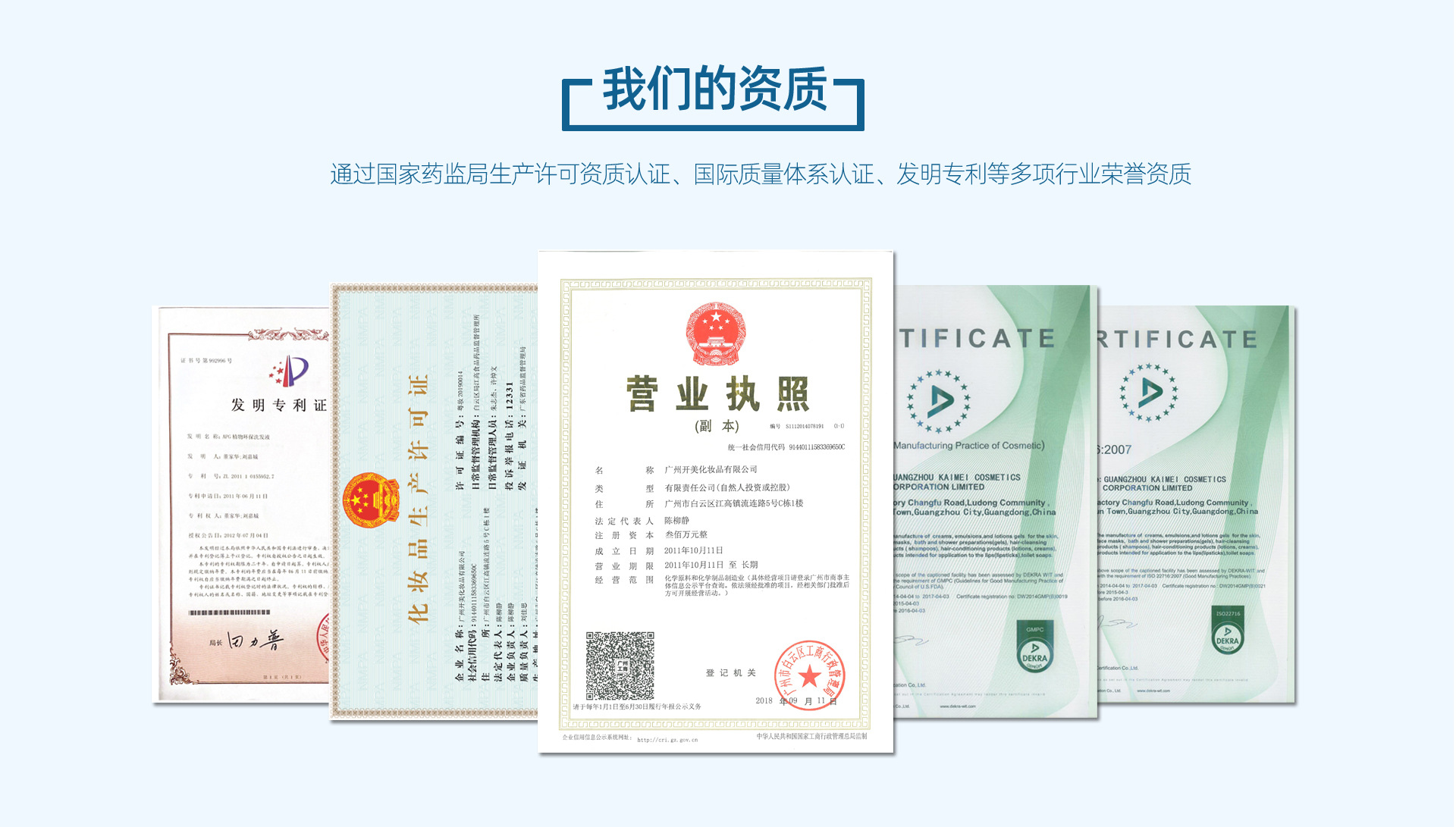 開美化妝品源頭廠家專業(yè)從事化妝品研發(fā)、策劃、生產(chǎn)為一體的集團化妝品企業(yè),專注于中高檔網(wǎng)絡熱銷和功效美容化妝品品牌及半成品OEM/ODM加工,已和國內(nèi)外多家化妝品知名品牌建立合作關系,我們擁有10000平方的正規(guī)化生產(chǎn)基地,有十幾年與大型知名化妝品企業(yè)合作經(jīng)驗的優(yōu)秀技術管理團隊,為你提供專業(yè)化的優(yōu)質(zhì)產(chǎn)品、優(yōu)質(zhì)服務。 公司十幾年來一直致力化妝品研究和推廣,擁有北大、中大、第四軍醫(yī)大專家組成的顧問團隊,資深質(zhì)量管理工程師專職保證產(chǎn)品質(zhì)量。秉承“三好一合理”(品質(zhì)好、信用好、服務好、價格合理)的經(jīng)營理念和“與時俱進,開拓創(chuàng)新”的企業(yè)文化,不斷開啟高品質(zhì)、國際化的多緯度的服務新篇章。 開美始終堅持“品質(zhì)決定再次消費”的原則,嚴把質(zhì)量關,確保產(chǎn)品質(zhì)量。面對日益劇烈的市場競爭,我們有實力讓您安心、讓您放心消費本公司產(chǎn)品,讓您真正體會到名牌產(chǎn)品的實惠和質(zhì)量的保證。