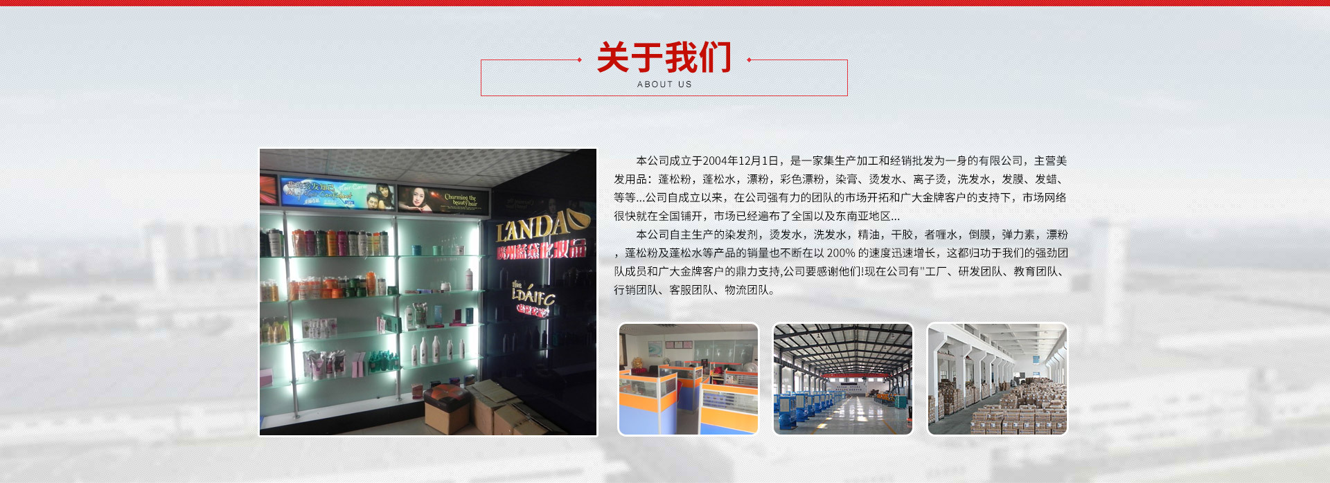 集洗護、造型、美發等產品專業生產加工的公司,本公司成立于2004年,是集研發、生產、銷售、為一體化的實力公司,經過十余年生產開發,成功的開發出了一系列的專業線、日化線美發用品品,牌下品牌分別有“柔順奇基”、“VIKADA/威卡達”、“等系列