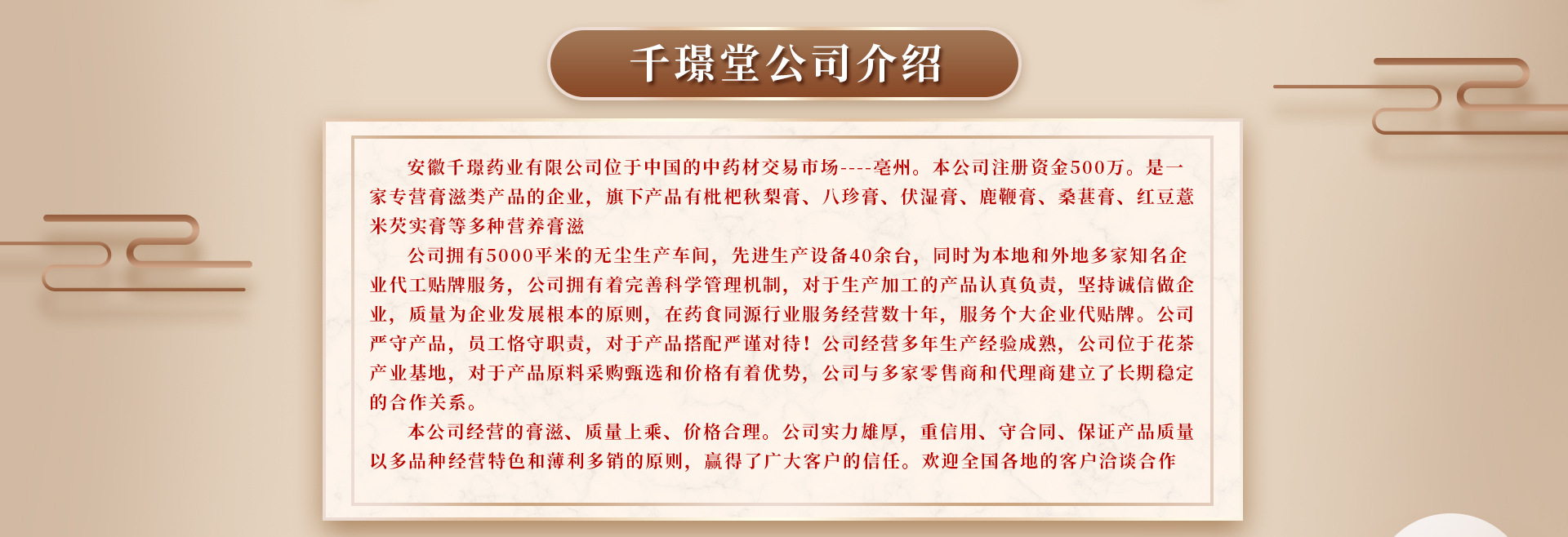 安徽千璟藥業(yè)有限公司位于中國的中藥材交易市場亳州。本公司注冊資金500萬。是一家專營膏滋類產(chǎn)品的企業(yè),旗下產(chǎn)品有 枇杷秋梨膏、八珍膏、伏濕膏、鹿鞭膏、桑葚膏、紅豆薏米芡實膏等多種營養(yǎng)膏滋。公司與多家零售商和代理商建立了長期穩(wěn)定的合作關系。本公司經(jīng)營的膏滋、質(zhì)量上乘、價格合理。公司實力雄厚,重信用、守合同、保證產(chǎn)品質(zhì)量,以多品種經(jīng)營特色和薄利多銷的原則,贏得了廣大客戶的信任。歡迎全國各地的客戶洽談合作。