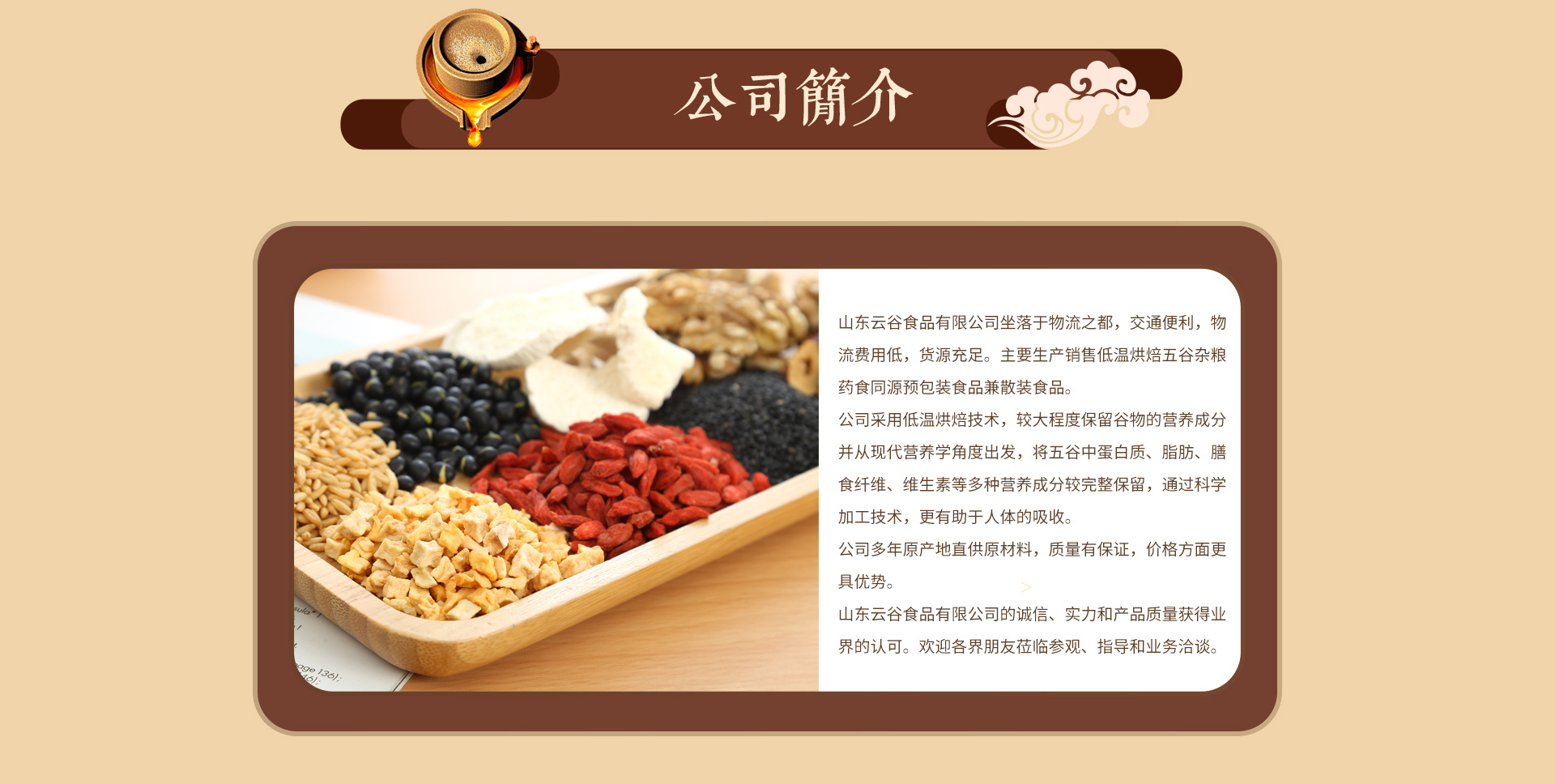 山東云谷食品有限公司坐落于物流之都,散貨物流運費低,交通便利,貨源充足。 主要生產銷售低溫烘焙五谷雜糧藥食同源預包裝食品兼散裝食品。 公司采用低溫烘焙技術,較大程度保留谷物的營養成分,并從現代營養學角度出發,將五谷中蛋白質、脂肪、膳食纖維、維生素等多種營養成分相對完整保留,通過科學加工技術,更有助于人體的吸收。 公司原產地直供原材料,質量有保證,價格方面更具優勢。 山東云谷食品有限公司的誠信、實力和產品質量獲得業界的認可。歡迎各界朋友蒞臨參觀、指導和業務洽談。