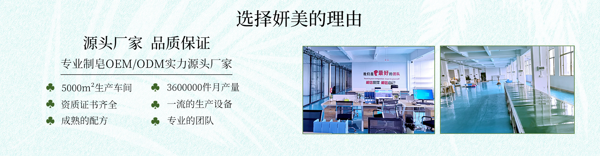 廣州妍美日化科技有限公司是一家化妝品研發、生產、銷售、技術服務、策劃咨詢,OEM/ODM品牌加工為一體的現代化大型企業。 公司位于廣州市。 公司自有先進的生產、檢測設備,以“信譽始立,品質為先”的經營宗旨,秉持以天然、有效、時尚、安全為標準,并以現代科技技術為依托,吸取國外先進生產理念,對人群的肌膚反復測試,研制出適合亞洲人的護膚品。 公司專注生產高品質的手工皂,我們根據市場需求,將源源不斷推出新品,同時嚴格檢測、認真執行標準,確保每一款產品高標準合格。歡迎各界朋友蒞臨參觀、指導和業務洽談。