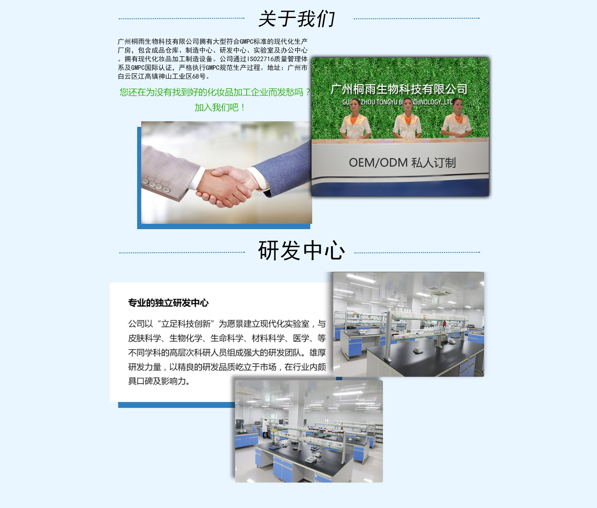 本公司集研發(fā)、生產、銷售一體化的企業(yè);自主品牌的生產與銷售;同時承接品牌商產品代加工服務。工廠車間環(huán)境:10萬級GMP無塵車間;可生產的產品:口腔用品、護膚、養(yǎng)生、精油、面膜、水、乳液、精華、膏霜、眼部產品、彩妝、洗發(fā)水、沐浴露、護發(fā)品及嬰幼兒產品等等!起定量靈活、交貨期快、生產能力擁有大噸位的真空乳化鍋多個;可承接大批量的產品生產。