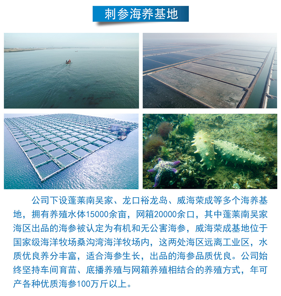 公司下設(shè)蓬萊南吳家、龍口裕龍島、威海榮成等多個養(yǎng)殖單位,擁有養(yǎng)殖水體15000余畝,海參養(yǎng)殖網(wǎng)箱30000余口,通過網(wǎng)箱養(yǎng)殖、深海底播的方式,年可產(chǎn)各種優(yōu)質(zhì)海參100萬斤以上。