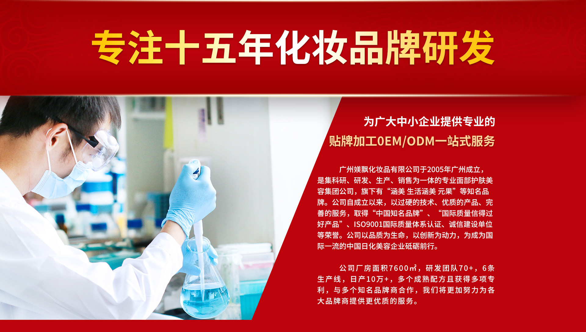 廣州媄飄化妝品有限公司于2005年廣州成立,是集科研、研發、生產、銷售為一體的專業面部護膚美容集團公司。公司自成立以來,以合理的價格、良好的口碑、過硬的質量、完善的售后服務,取得“中國知名品牌”、“國際質量信得過好產品”、ISO9001國際質量體系認證、誠信建設單位等榮譽。公司以品質為生命,以創新為動力,為成為國際一流的中國日化美容企業砥礪前行。 公司廠房面積7600㎡,研發團隊70+,6條生產線,日產10萬+,多個成熟配方且獲得多項專利,與多個知名品牌商合作,我們將更加努力為各大品牌商提供更優質的服務