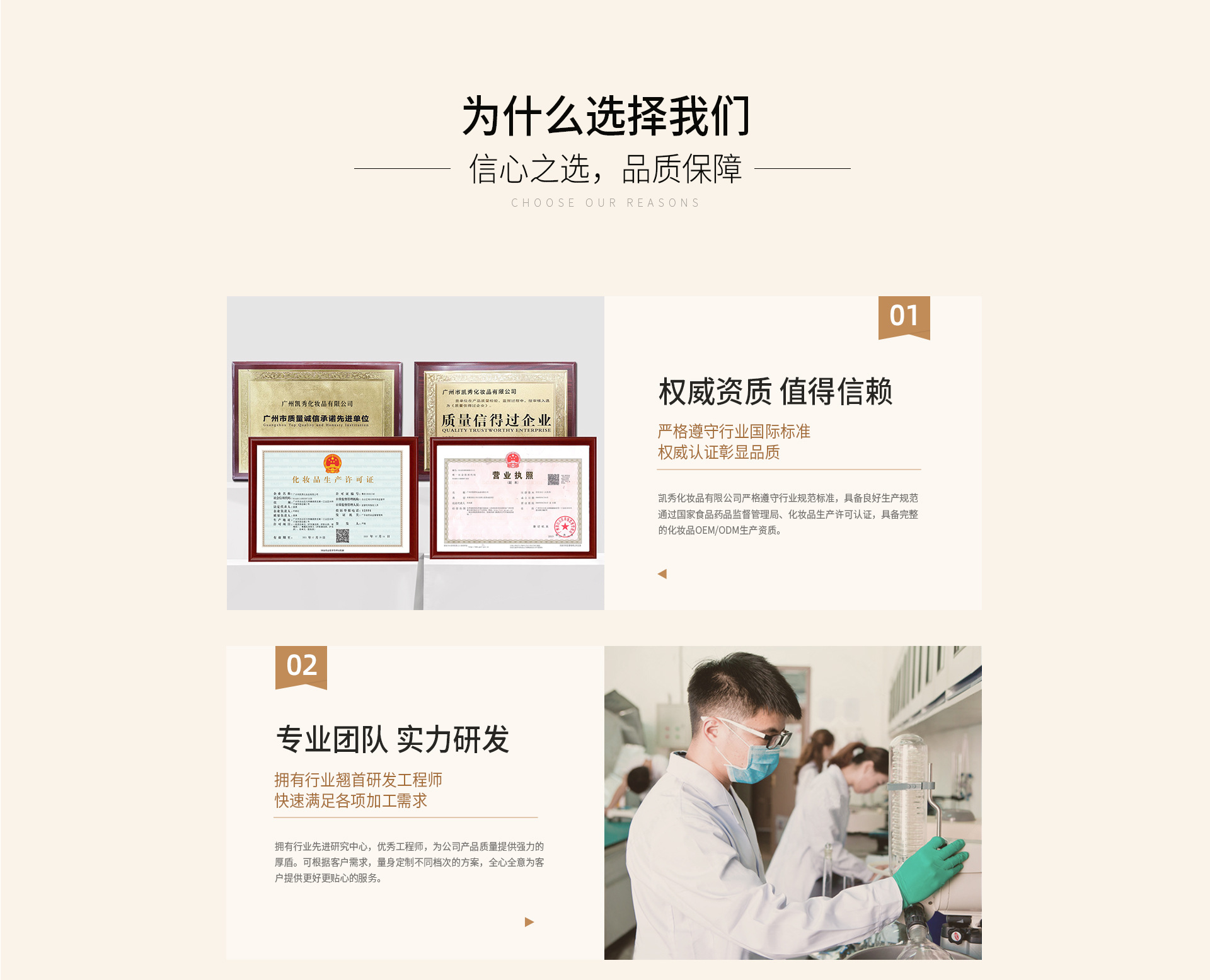 我們是一家集科研、開發(fā)、設計、生產、銷售、OEM/ODM于一體的專業(yè)化妝品生產現代化企業(yè)。本著前衛(wèi)的眼光,豐富的經驗,專業(yè)的技術及優(yōu)異的品質,致力于不斷開拓出更尖端、更能引導時尚潮流的“高、精、新”產。產品行銷全國,并出口東南亞、港臺、俄羅斯、韓國、日本、美國等國家和地區(qū)。 先進的科研和強大的生產能力,是凱秀騰飛的基礎保障。在激烈的市場競爭中,凱秀堅持民族化品牌走民族振興之路,始終以東方草本與現代化尖端科技相結合的先進理念,其中開發(fā)的草本系列產品,受到消費者的熱烈追捧,更成為持續(xù)暢銷的精典產品。目前,凱秀從德國和美國引進了國際尖端生產設備嚴格按照ISO9002-2000標準生產,嚴格保證每一出廠產品的質量。雄厚的技術力量,先進的生產設備,多年OEM服務之精髓,大大開拓了國內外OEM業(yè)務,受到國內外客戶的認同并取得了良好的市場反應。