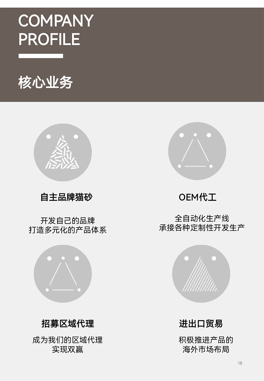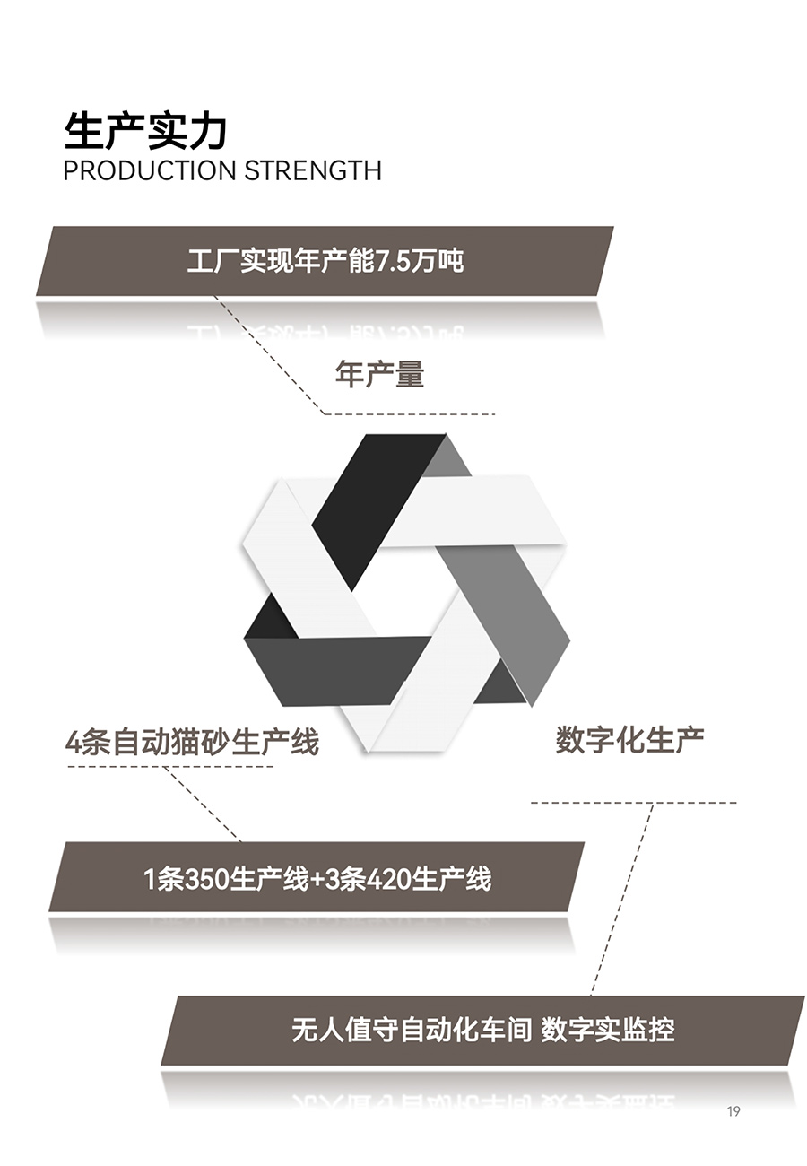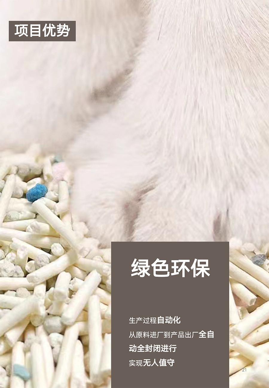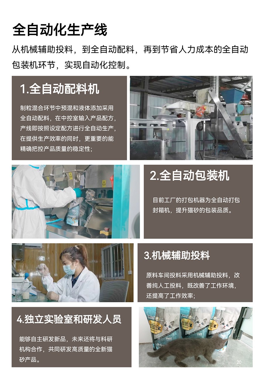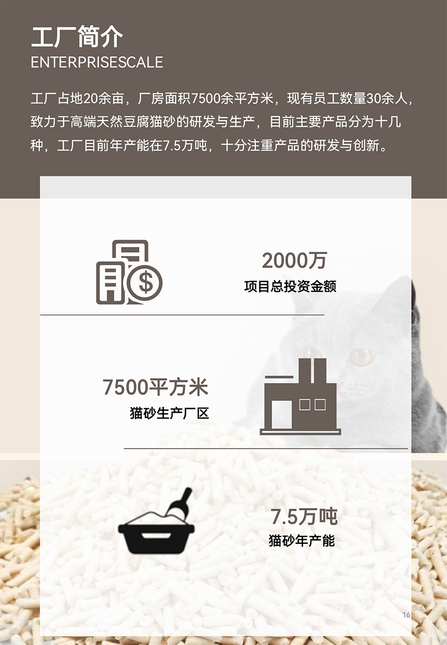 工廠占地20余畝,廠房面積7500余平方米,現有員工數量30余人,致力于高端天然豆腐貓砂的研發與生產,目前主要產品分為十幾種,工廠目前年產能在7.5萬噸,十分注重產品的研發與創新。