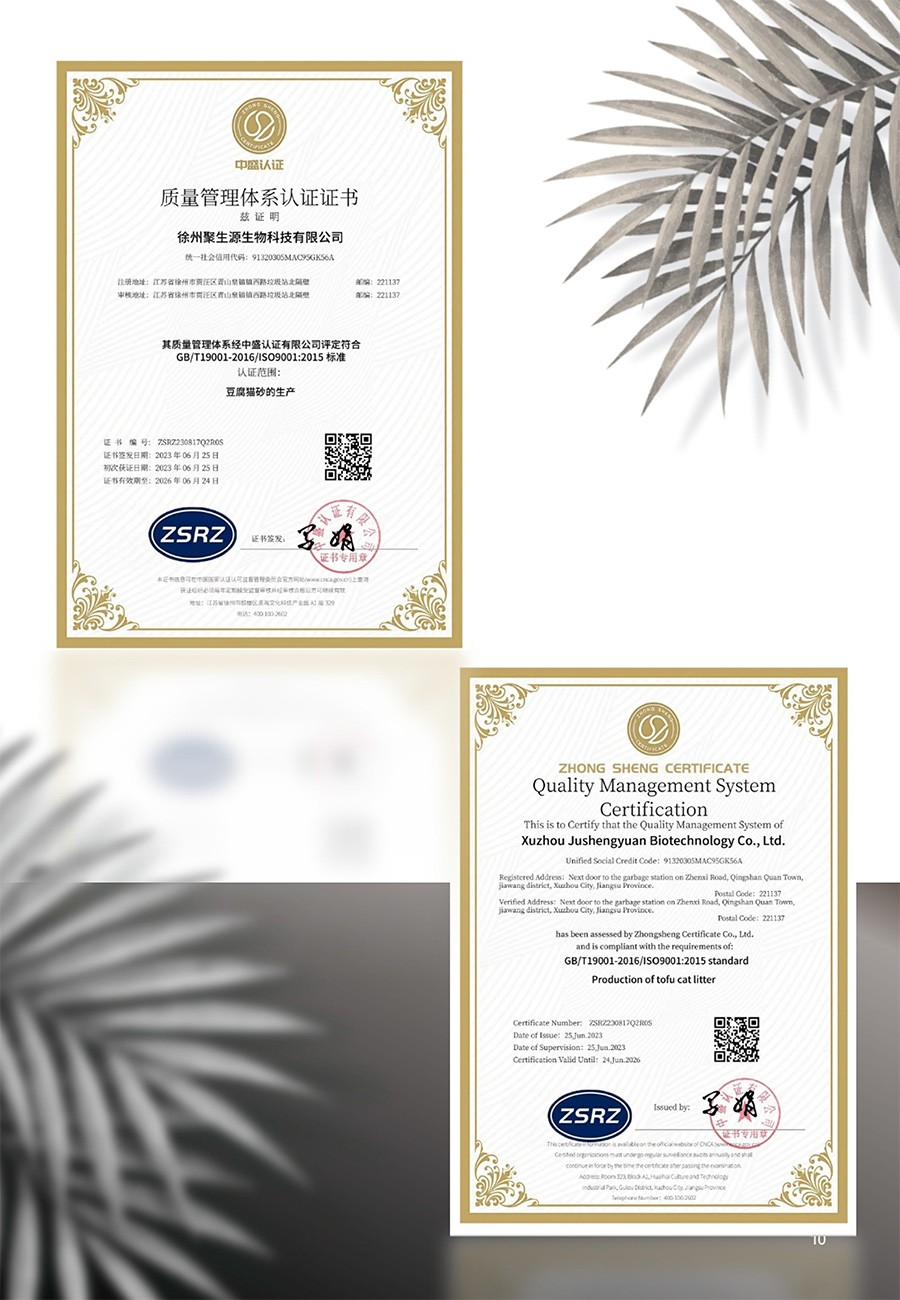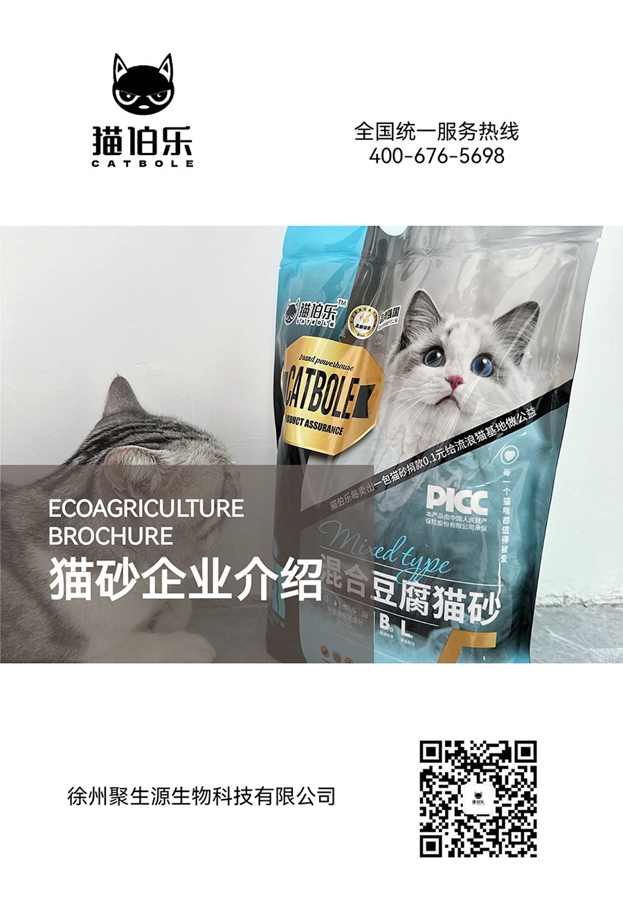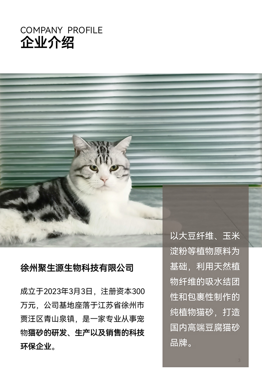 徐州聚生源生物科技有限公司成立于2023年3月3日,注冊資本300萬元,公司基地座落于江蘇省徐州市賈汪區青山泉鎮,是一家專業從事寵物貓砂的研發、生產以及銷售的科技環保企業。以大豆纖維、玉米淀粉等植物原料為基礎,利用天然植物纖維的吸水結團性和包裹性制作的純植物貓砂,打造國內高端豆腐貓砂品牌。