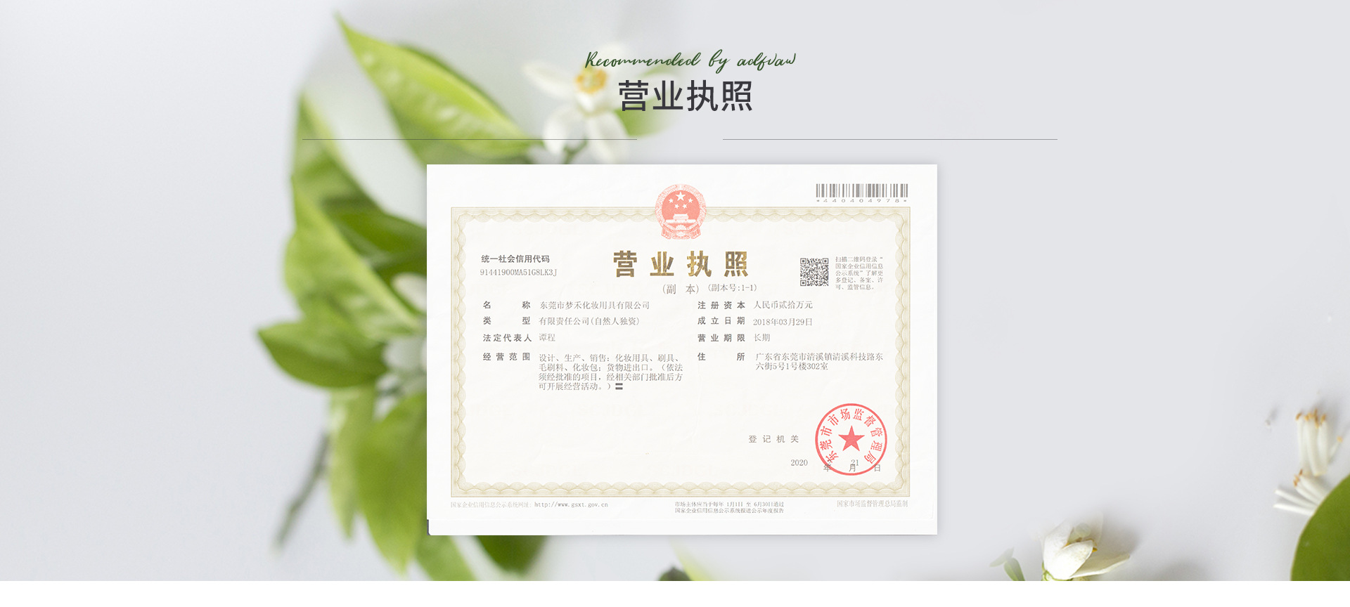 公司成立于2009年,從事化妝工具行業已有10余年。東莞市夢禾化妝用具有限公司是一家集研發. 生產.銷售于一體的規模化生產化妝用具的專業廠家,目前有自動導墨眼線.唇膏筆. 睫毛刷.伸縮刷.自動腮紅噴粉刷.禮品套刷,專業化妝刷等系列產品,款式多樣,精美別致。每年有五千萬的化妝用具產品從夢禾走向全世界!公司擁有5000多平方米廠房,100多名有專業技術的員工。60多臺生產設備如自動燙毛機器,睫毛卷自動成型機,全自動化拉絲機,全自動化整毛機。產品銷售于美國,英國,德國,法國,澳大利亞,日本,東南亞等二十多個國家,