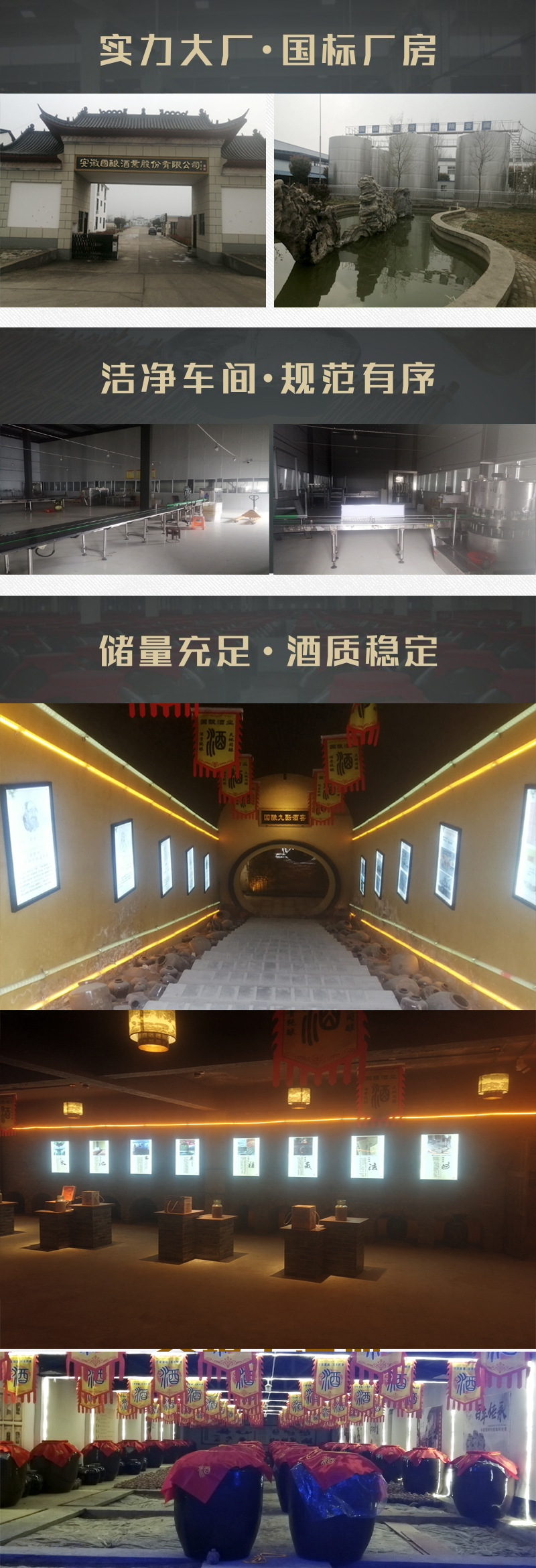【國釀股份】安徽湯曹酒業有限公司坐落于名酒之鄉——安徽省亳州市古井鎮,亳州—是神醫華佗魏武帝曹操的故鄉。東漢建安年間,曹操將家鄉譙郡(今亳州市)產的「九醞春酒」進獻給獻帝劉協,并上表說明「九醞春酒」的制法。 我們公司是一家白酒生產銷售、企業定制、白酒貼牌、養生酒藥酒代加工、設計研發擁有地下酒窖4000平方地下恒溫窖藏酒窖為您私人定制酒提供一站式服務。 公司生產的白酒采用古井無極之水,選用優質高粱為原料,小麥、大麥、豌豆制曲,固態泥池老窖發酵,老五甄蒸餾法蒸餾而成。酒質色澤清透、口感柔順、香味自然、回味甘美,具有綿、甜、凈、爽、香、醇、厚之特點。我公司是一家觀念更新,發展迅速的股份制企業,有現代化的流水線作業和先進的檢測設備,采用傳統的釀酒工藝和現代科學技術相結合,從出酒到組裝全部采用經國家檢測合格的軟不銹鋼管,完全避免了塑化劑的產生,我們愿于各經銷商一道:合作共贏,共謀發展。