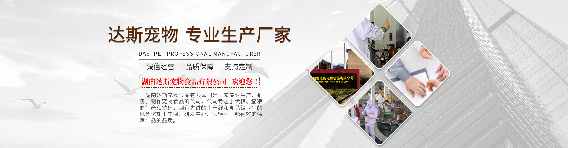 湖南達斯寵物食品有限公司是一家高起點的專業寵物食品公司,生產基地坐落于美麗的湖南長沙。公司專注于犬糧、貓糧的生產和銷售,擁有先進的生產線和食品級衛生的現代化加工車間、研發中心、實驗室,能有效的保障產品的品質。公司擁有高水平的動物營養專家和制造工程師,并聯合眾多寵物食品研究專家,積極引進并消化寵物食品先進技術。面對高速發展的寵物食品市場,達斯人準確把握市場需求,推出一系列擁有良好性價比的寵物鮮肉糧,其特點是在原材料選擇方面采用了大量然鮮肉食材和食品原材料,使產品在營養、衛生和消化率方面都達到了寵物食糧的高水平