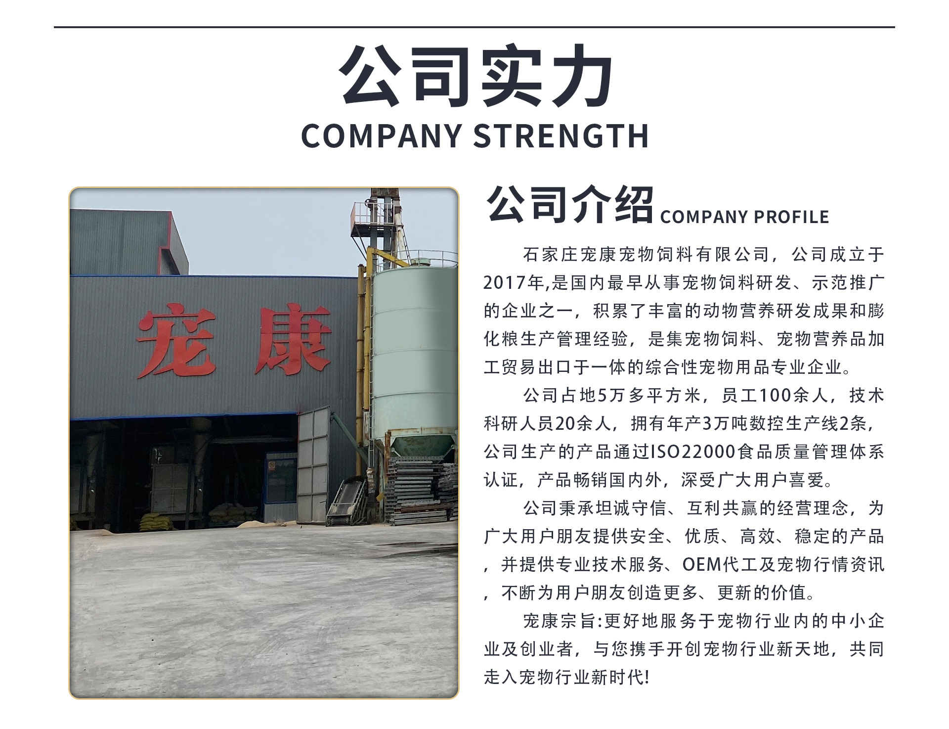 石家莊寵康寵物飼料有限公司,公司成立于2017年,是國內最早從事寵物飼料研發、示范推廣的企業之一,積累了豐富的動物營養研發成果和膨化糧生產管理經驗,是集寵物飼料、寵物營養品加工貿易出口于一體的綜合性寵物用品專業企業。 公司占地5萬多平方米,員工100余人,技術科研人員20余人,擁有年產3萬噸數控生產線2條,公司生產的產品通過ISO22000食品質量管理體系認證,產品暢銷國內外,深受廣大用戶喜愛。 公司秉承坦誠守信、互利共贏的經營理念,為廣大用戶朋友提供安全、優質、高效、穩定的產品并提供專業技術服務、OEM代工及寵物行情資訊不斷為用戶朋友創造更多、更新的價值。 寵康宗旨:更好地服務于寵物行業內的中小企 業及創業者,與您攜手開創寵物行業新天地,共同走入寵物行業新時代!