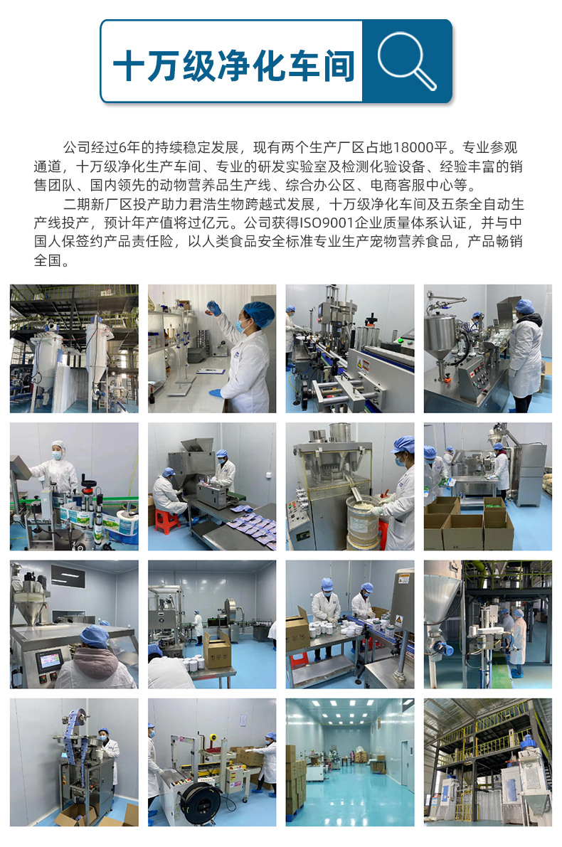 二期新廠區投產助力君浩生物跨越式發展,十萬級凈化車間及五條全自動生產線投產,預計年產值將過億元。公司獲得ISO9001企業質量體系認證,并與中國人保簽約產品責任險,以人類食品安全標準專業生產寵物營養食品,產品暢銷全國。