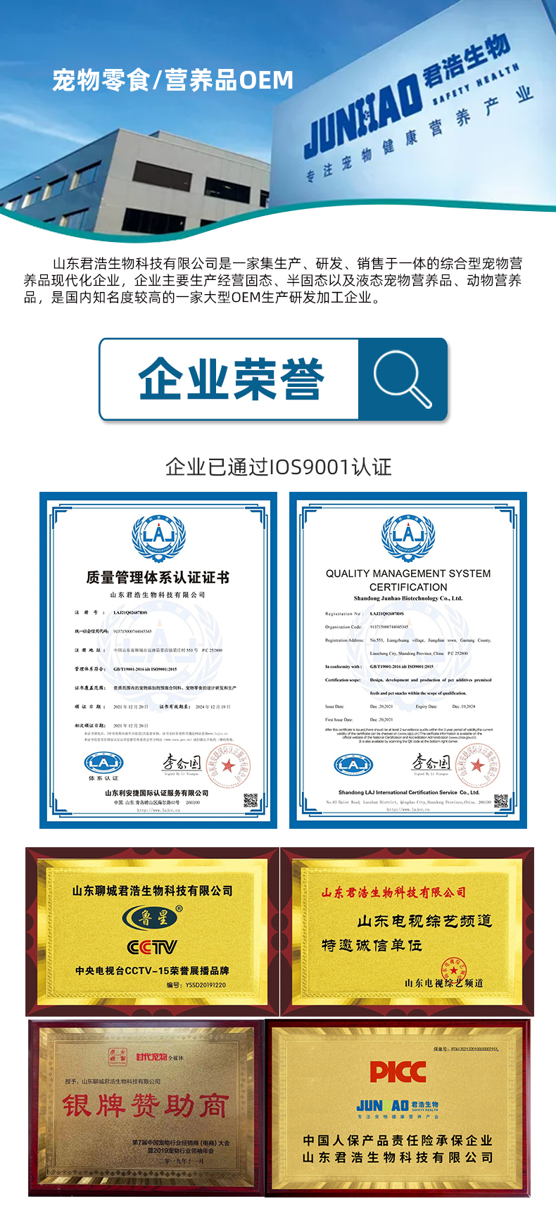 山東君浩生物科技有限公司是一家集生產、研發、銷售于一體的綜合型寵物營養品現代化企業,企業主要生產經營固態、半固態以及液態寵物營養品、動物營養品,是國內知名度較高的一家大型OEM生產研發加工企業。