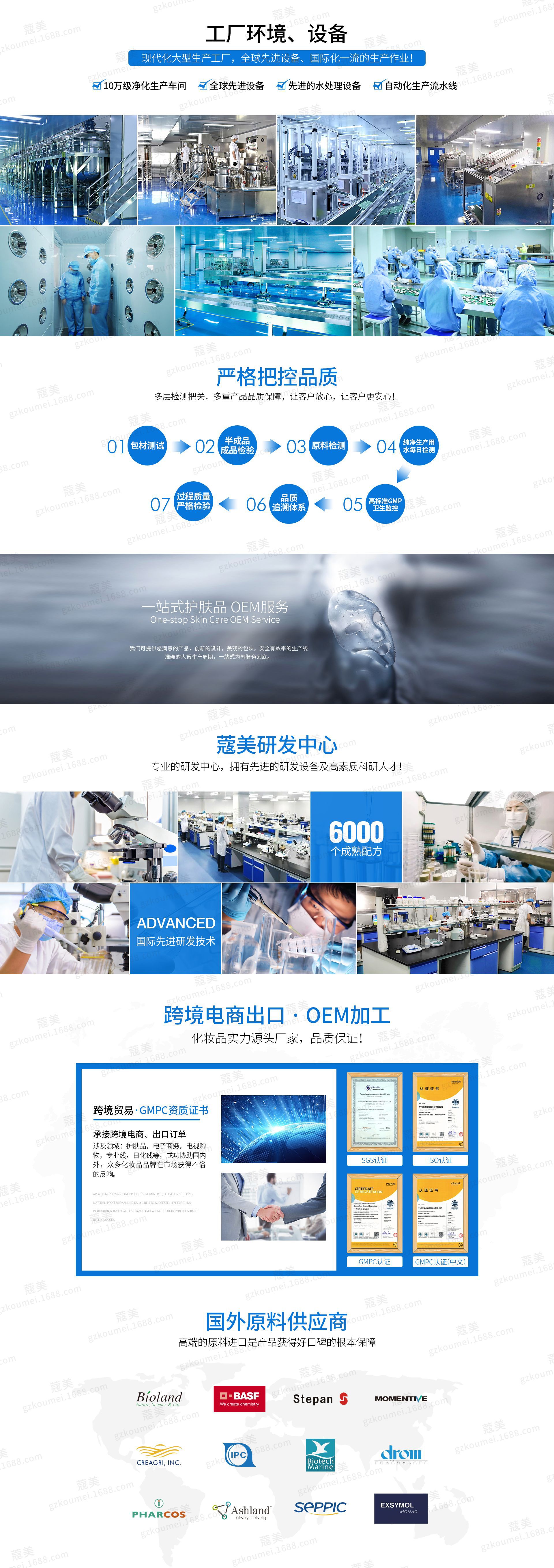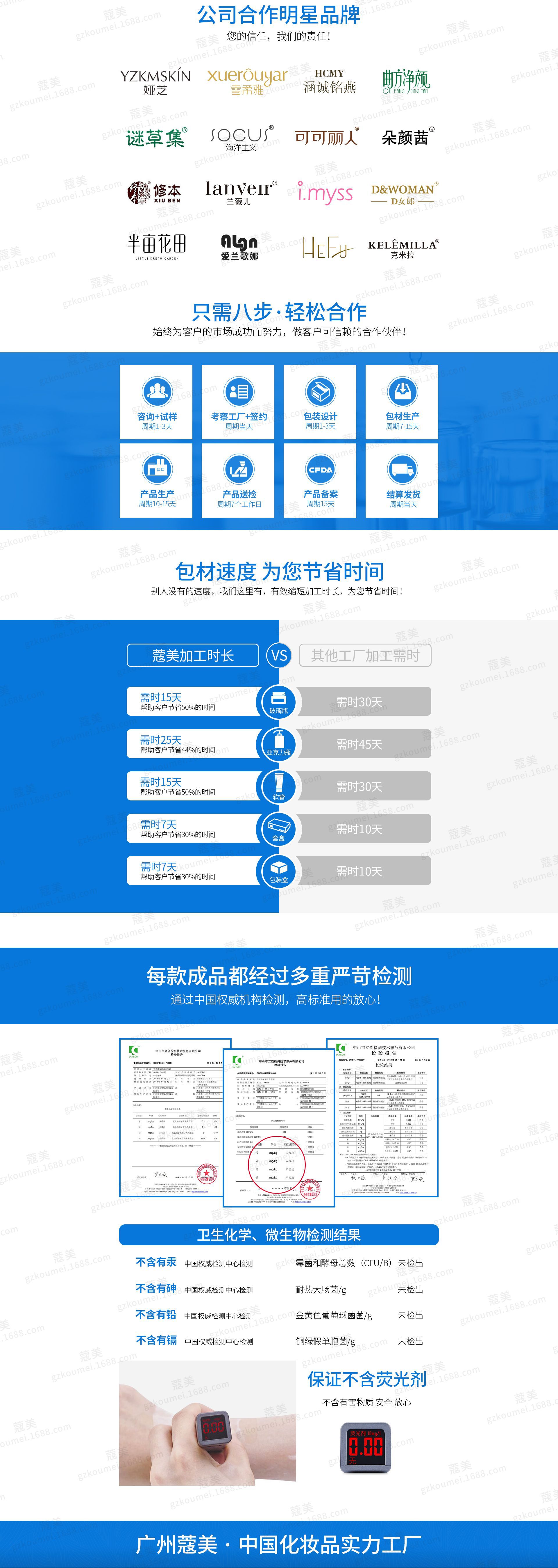 廣州蔻美化妝品科技有限公司是一間集化妝品研發(fā)、品牌服務(wù)、生產(chǎn)加工一體的專業(yè)化妝品OEM/ODM代加工公司。工廠嚴(yán)格按照GMPC標(biāo)準(zhǔn)建設(shè),嚴(yán)格遵守IS022716,對(duì)生產(chǎn)廠房、原料和包裝材料、生產(chǎn)過程、成品以及出入庫(kù)、人員衛(wèi)生等進(jìn)行科學(xué)管理;我們真誠(chéng)待客,和客戶互相支持共同前進(jìn);